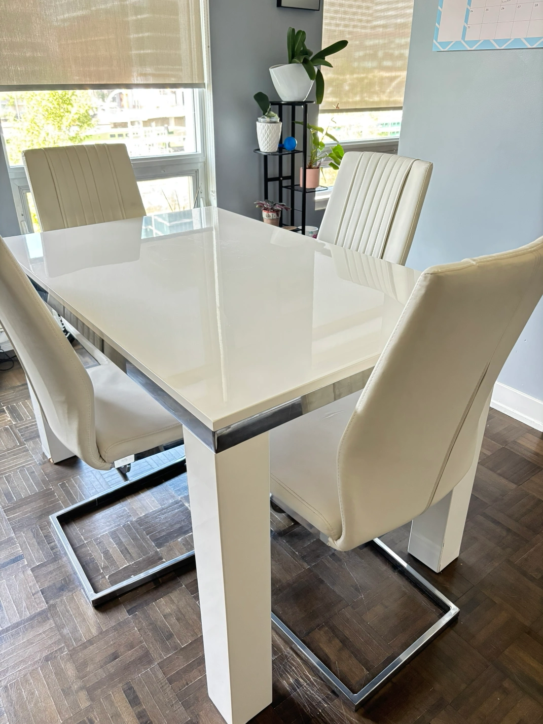 Selling a dining table with four white leather chairs. The chairs are upholstered in white leather with a chrome base. There are some signs of wear on one of the chairs, and the bottom of one of the table legs, as pictured. Pick up only please.