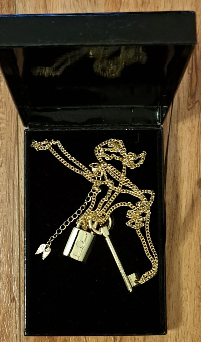 This is a Victoria's Secret Scandalous necklace featuring a lock and key charm. It's gold-toned with a delicate chain and includes a Victoria's Secret branded gift box. This necklace would make a sweet accessory for a night out!