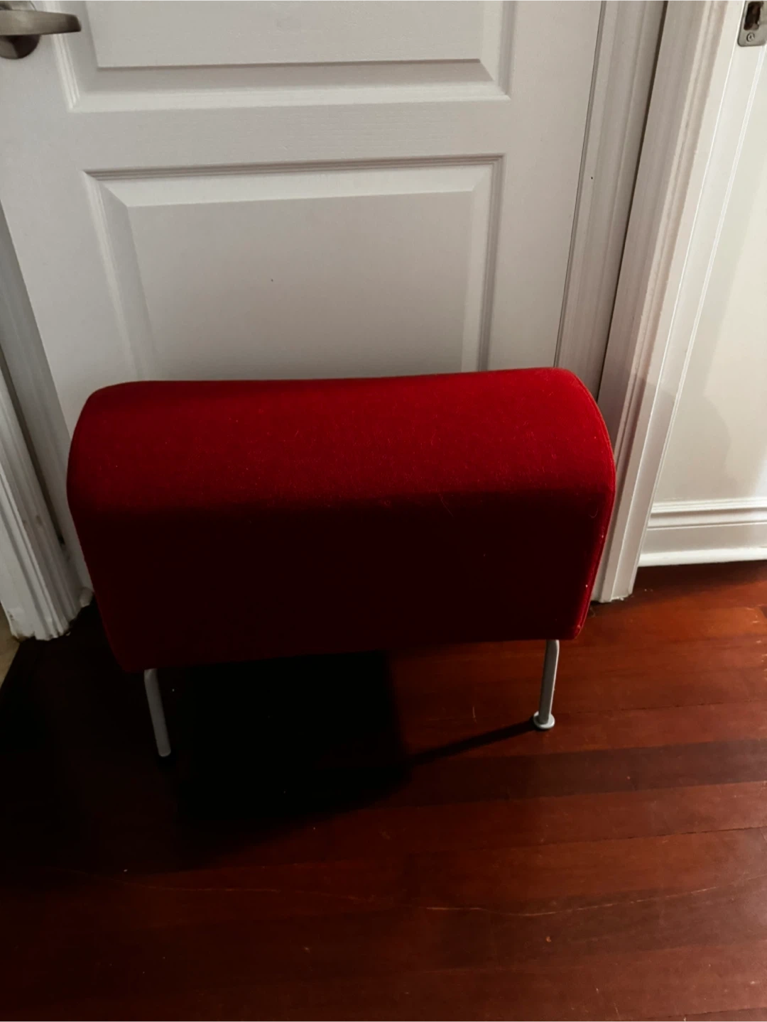 Red upholstered stool with a curved top. It has four silver metal legs. Perfect for putting your feet up or as a small seat.