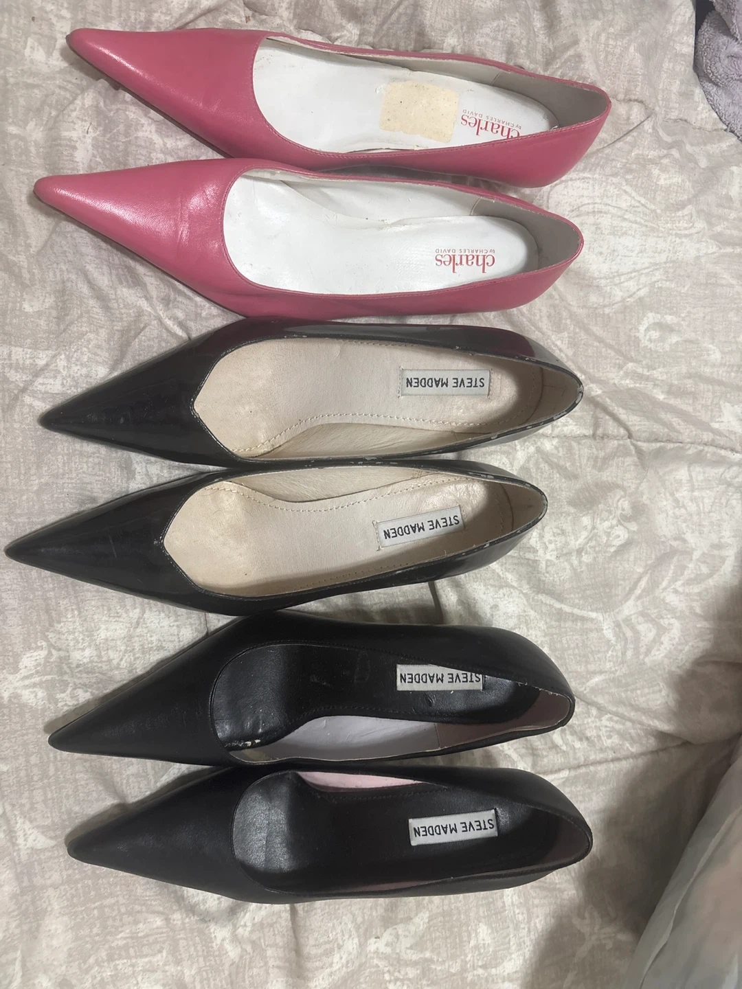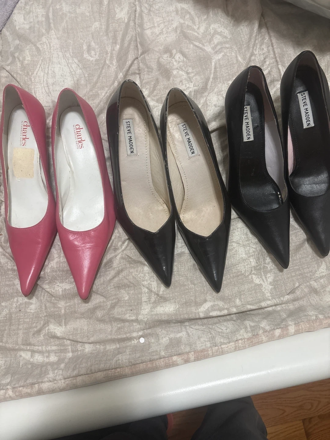 A collection of four women's heels featuring two pairs in black patent leather and two pairs in pink leather. Both brands, Steve Madden and Charles by Charles David, are represented. Styles include pointed toes and classic pumps.