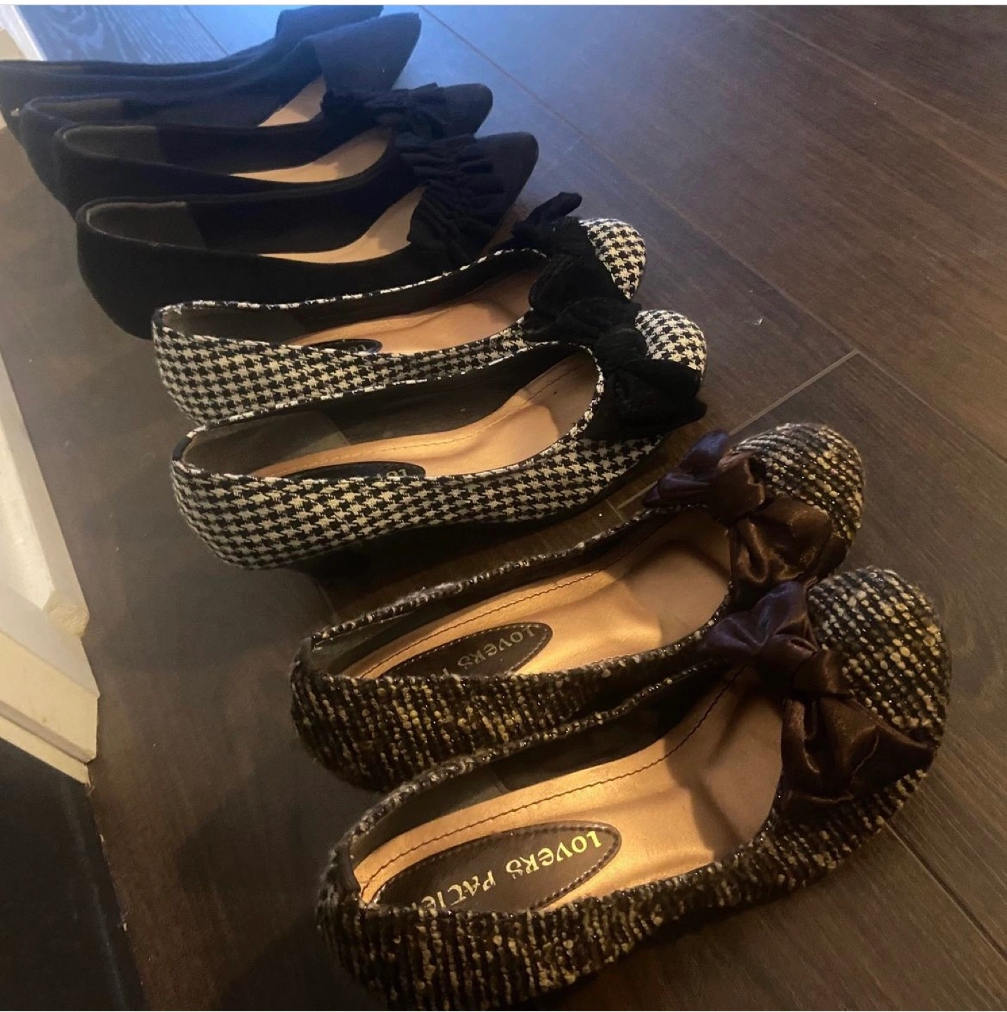 Five pairs of women's shoes, various styles and colours. Mostly low heels. One pair is navy and two pairs are a tweed. Some have bows. Very pretty and comfortable to walk!