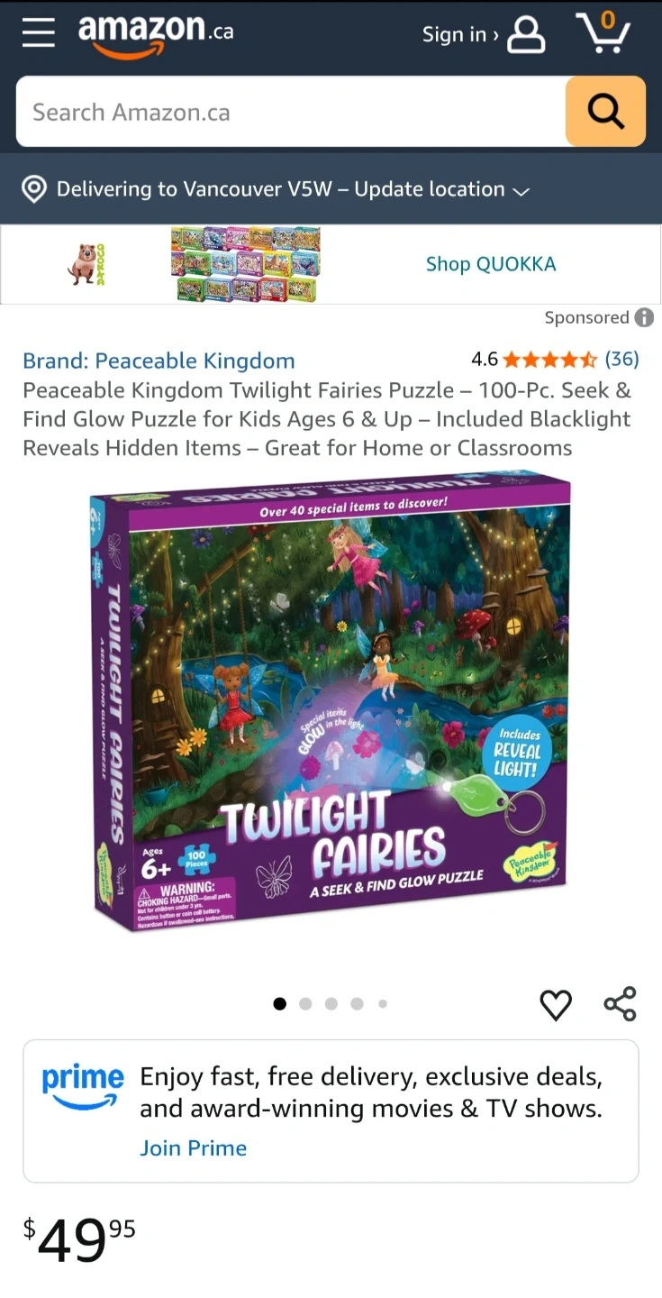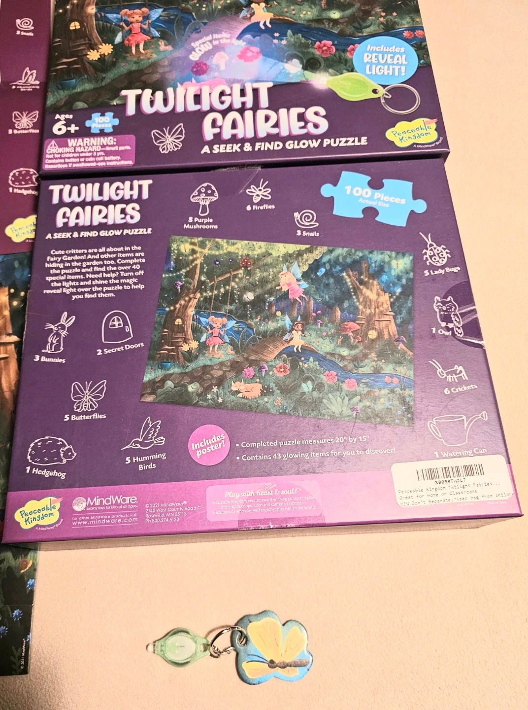Educational Fun 100-piece "Twilight Fairies" seek & find glow puzzle by Peaceable Kingdom. It includes a poster and a cool special reveal light to help find glowing items. Suitable for ages 6 and up. Completed puzzle measures 20" by 15" $10
