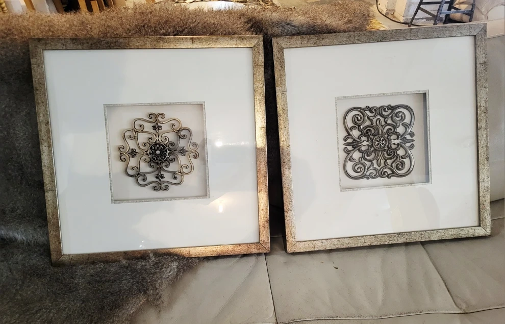 Add a touch of elegance to your home decor with this set of two 19" square, framed wall art pieces, each featuring intricate metal scrollwork and a classic design. The pieces are in new condition and ready to hang, bringing a sophisticated and timeless appeal to any room, retail, salon.
