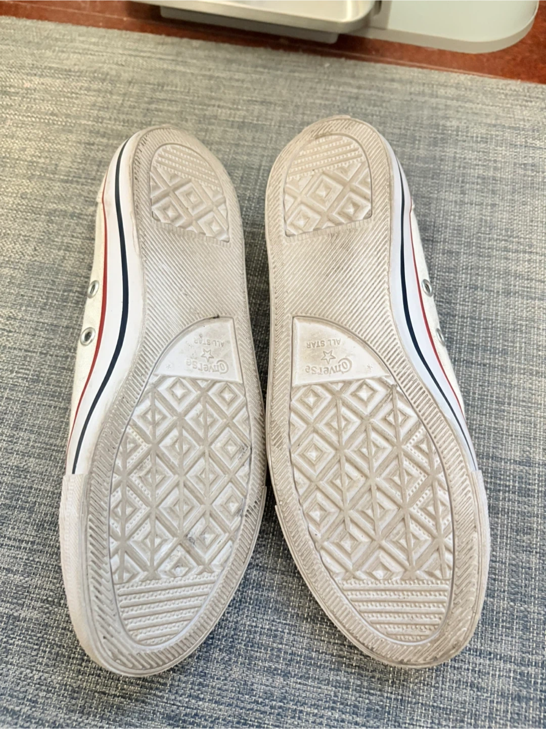 These are a pair of white Converse All Star canvas slip-on shoes. They feature the classic Chuck Taylor All Star logo on the tongue. The rubber sole provides good traction. Size 7