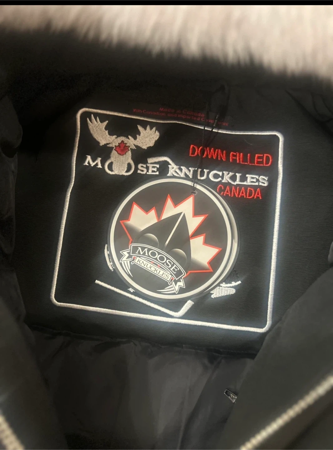 This is a Moose Knuckles black bomber jacket. It's down-filled and features a fur-lined hood. It's made in Canada with Canadian and imported components.