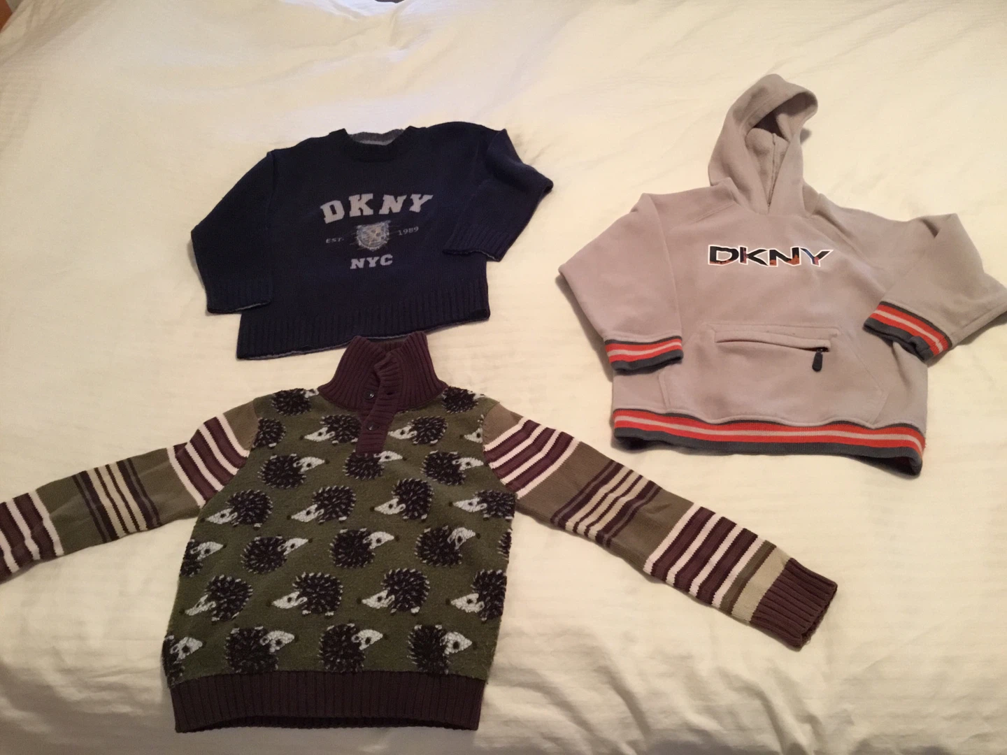 Selling a bundle of DKNY kids' clothing. Includes two sweaters and a hoodie. All in good condition and ready for a new kiddo to enjoy!