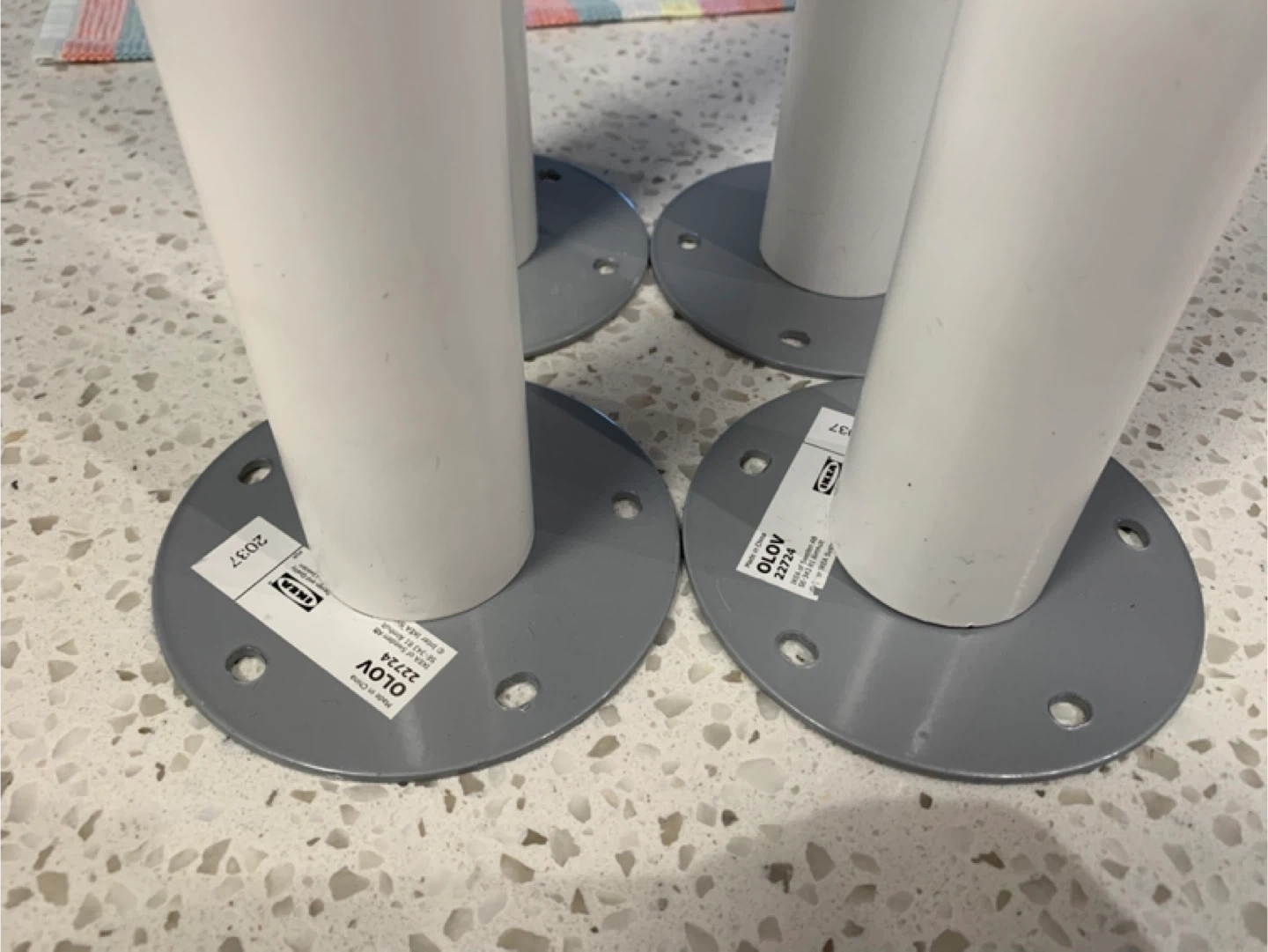 Set of four IKEA OLOV adjustable legs for furniture. White and grey colour. They're designed for easy attachment to create or modify tables and work surfaces. Includes mounting plates.$5each or $15 for all