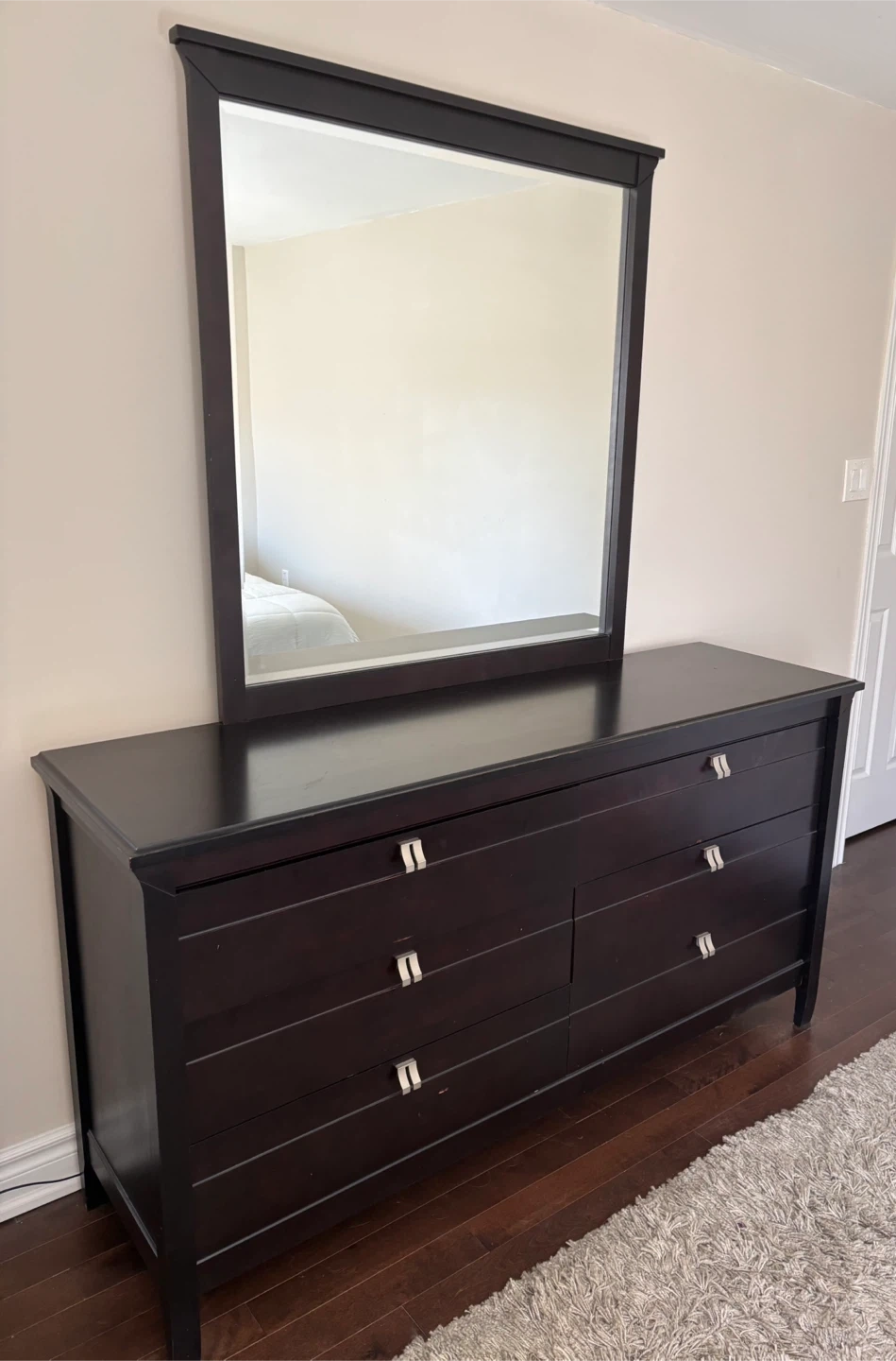A six-drawer dresser with a matching mirror. It's a dark brown colour with silver drawer pulls. The dresser is made of maple wood.