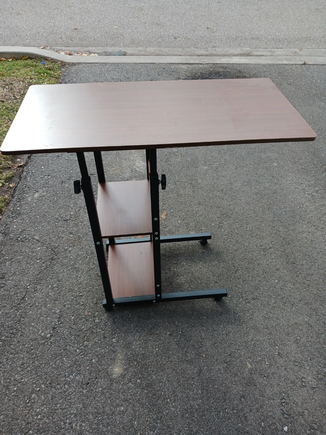 Selling a handy adjustable height rolling laptop desk. It's in great shape and perfect for working from home or anywhere you need a mobile workstation! The desk features a brown tabletop and a black metal frame with shelving.
