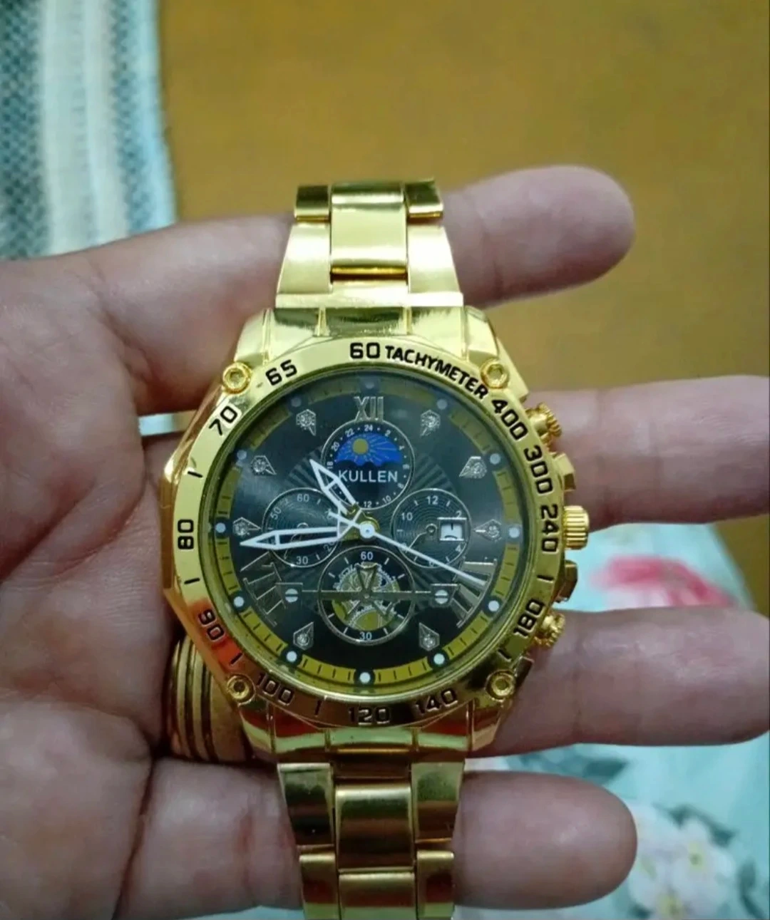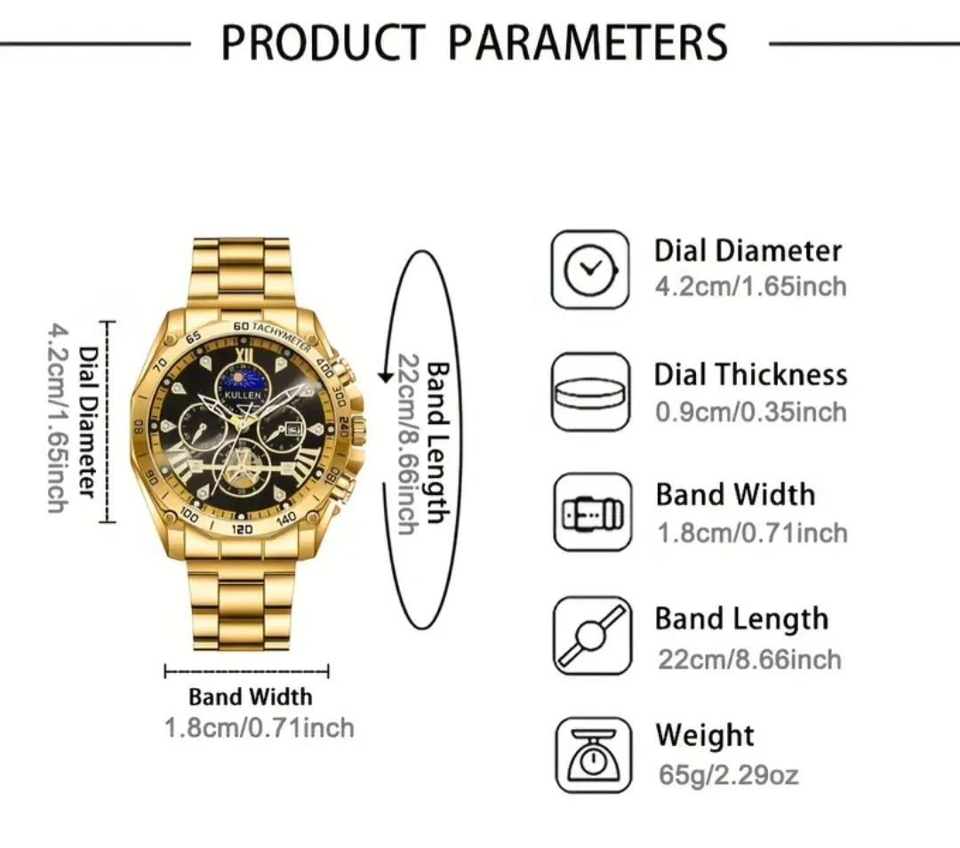 This is a KULLEN men's wristwatch. It features a golden metal band and casing. The dial diameter is 4.2cm and the band width is 1.8cm.