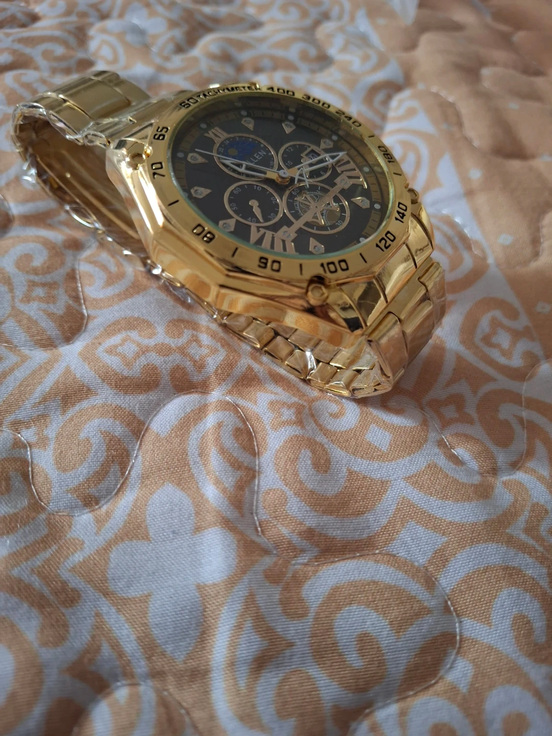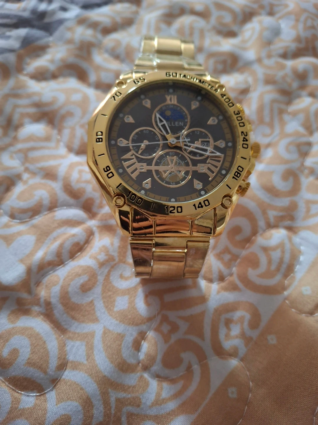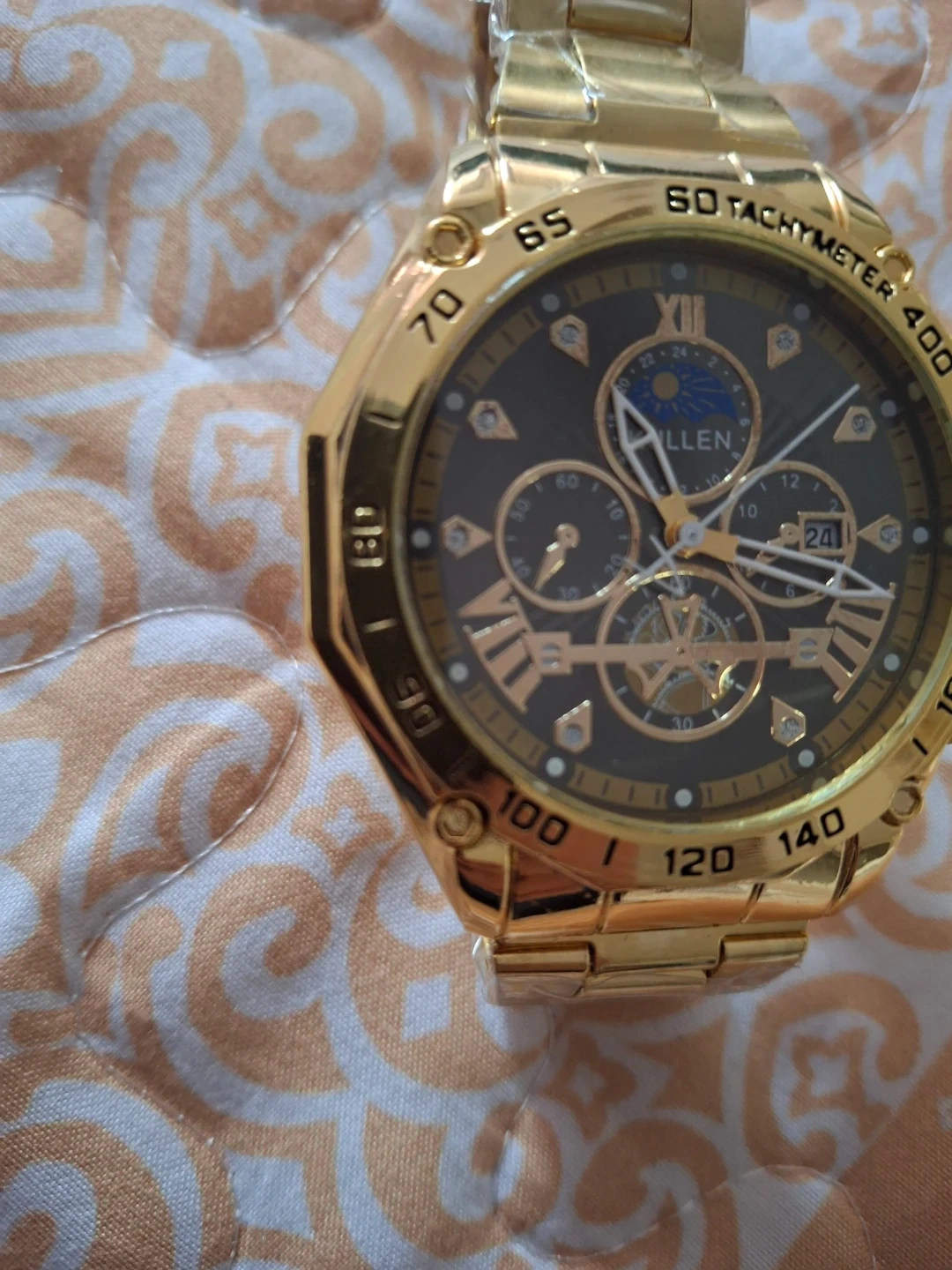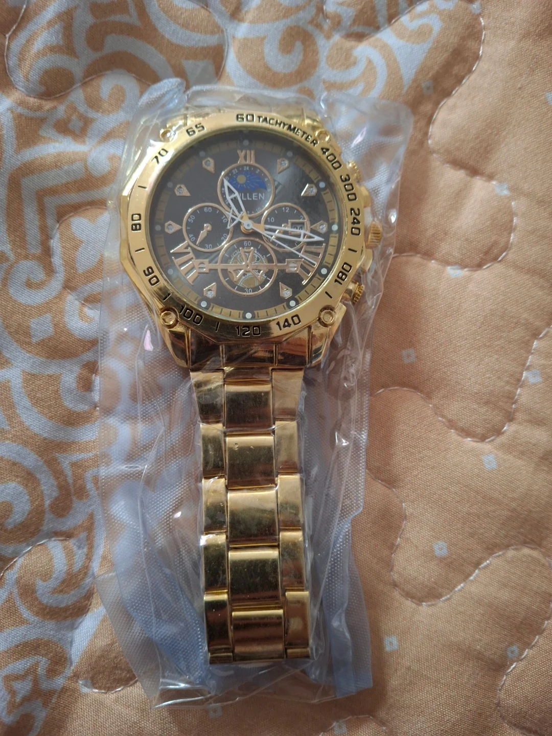 This is a KULLEN men's wristwatch. It features a golden metal band and casing. The dial diameter is 4.2cm and the band width is 1.8cm.