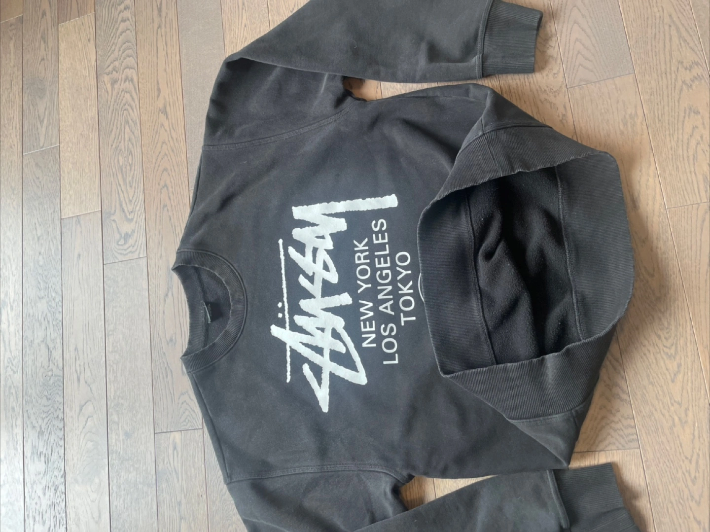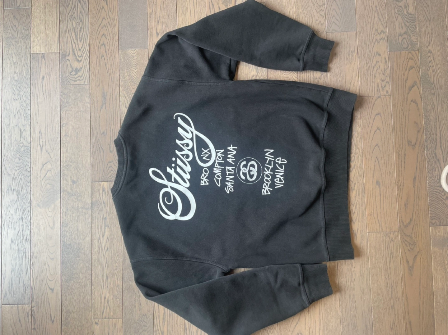 Black Stüssy crewneck sweatshirt with New York, Los Angeles, Tokyo, London, Paris, Brooklyn, Venice, and Santa Ana graphics. Cotton blend material.