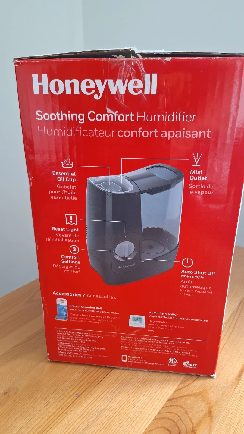 I'm selling a Honeywell Soothing Comfort Humidifier. It features warm mist, essential oil feature, wide tank opening, and auto shut off. It provides up to 99.5% bacteria free mist. No filter is required. It can run up to 24 hours with a capacity of 1 gallon. It also comes with the box!