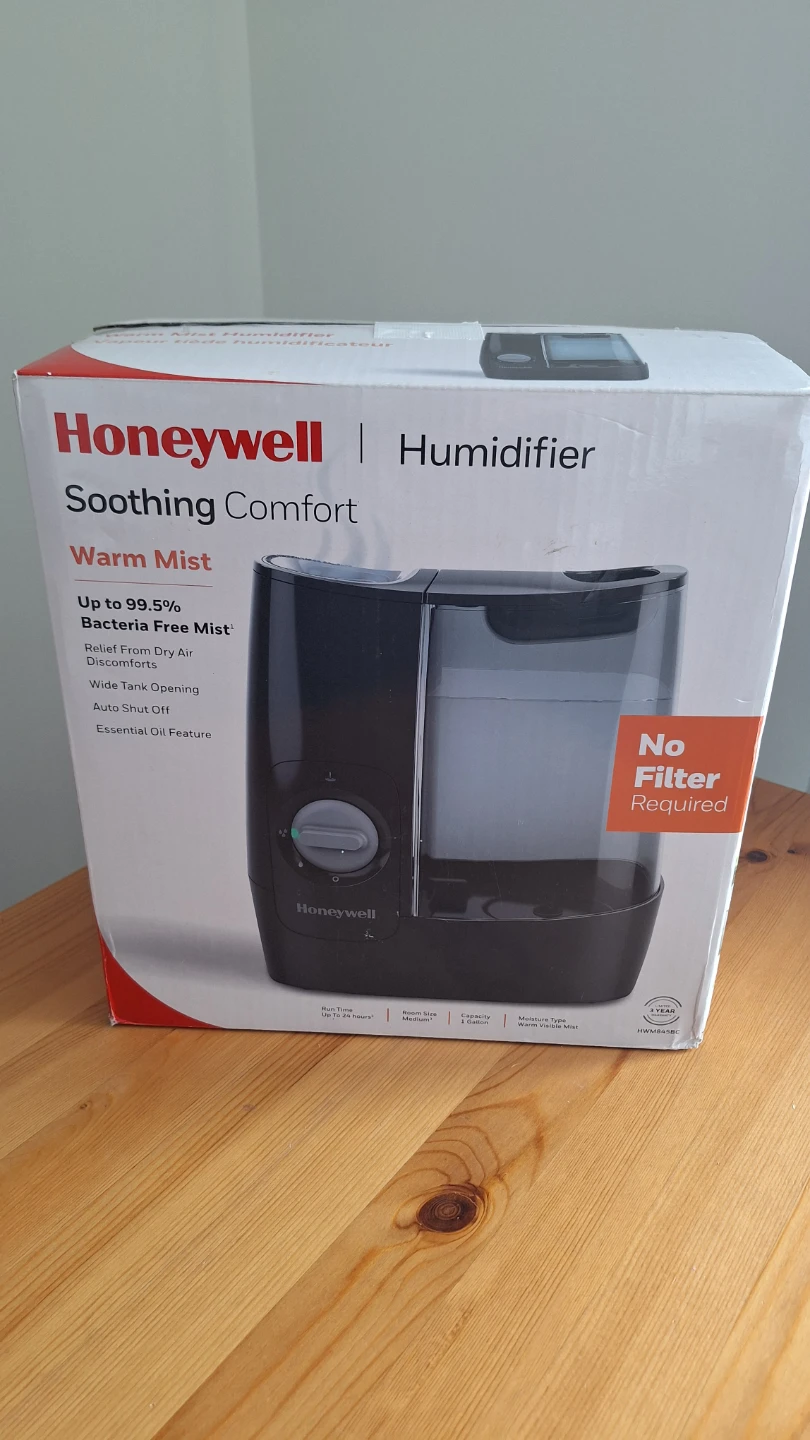 I'm selling a Honeywell Soothing Comfort Humidifier. It features warm mist, essential oil feature, wide tank opening, and auto shut off. It provides up to 99.5% bacteria free mist. No filter is required. It can run up to 24 hours with a capacity of 1 gallon. It also comes with the box!