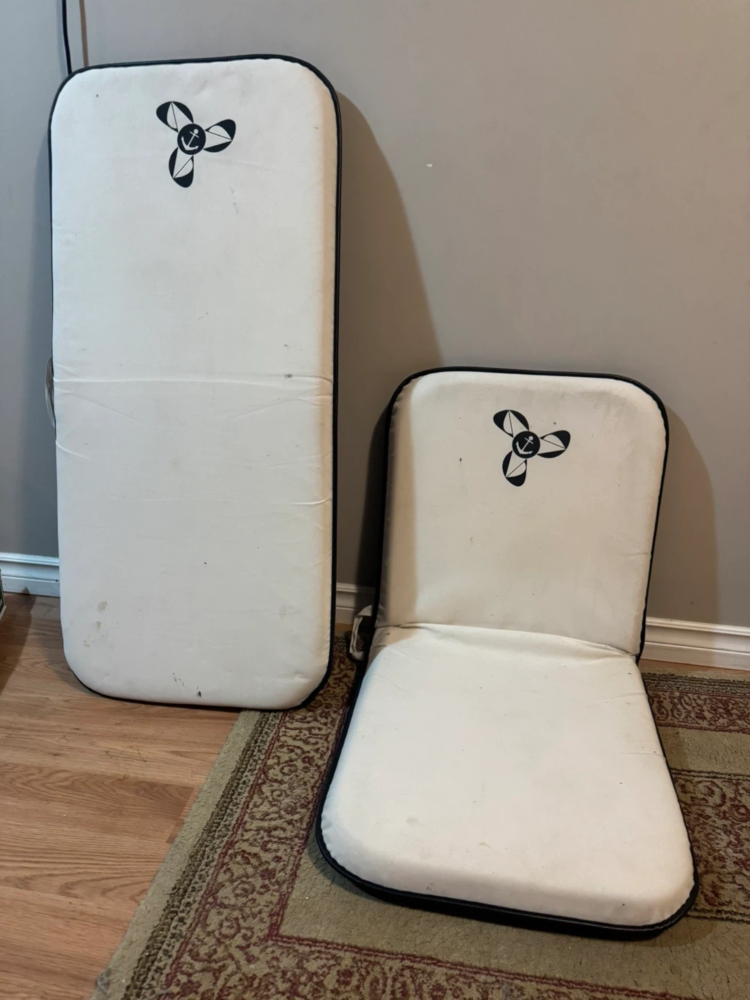 Two white padded cushion seats, perfect for a boat or outdoor seating. They're foldable for easy storage. Water-resistant material.
