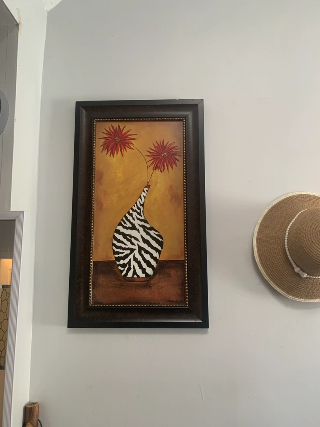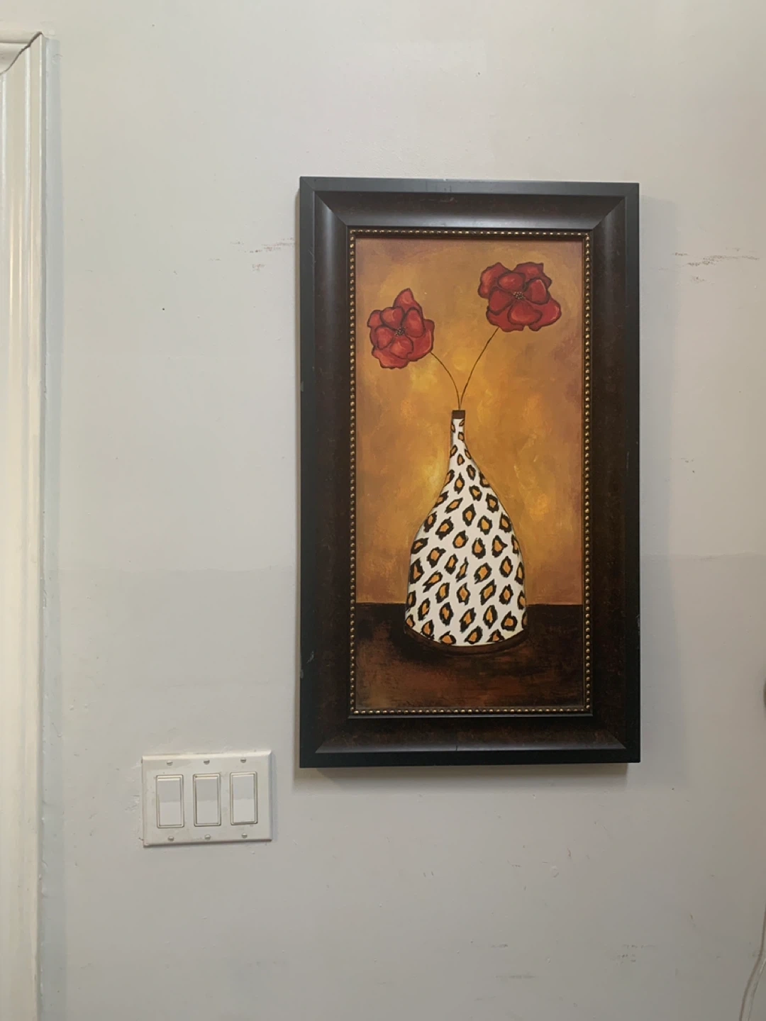 This framed wall art see features a decorative vase with two red flowers. The vase design in one includes a leopard print pattern and the other a zebra print pattern. It's ready to hang and adds a unique touch to your decor.