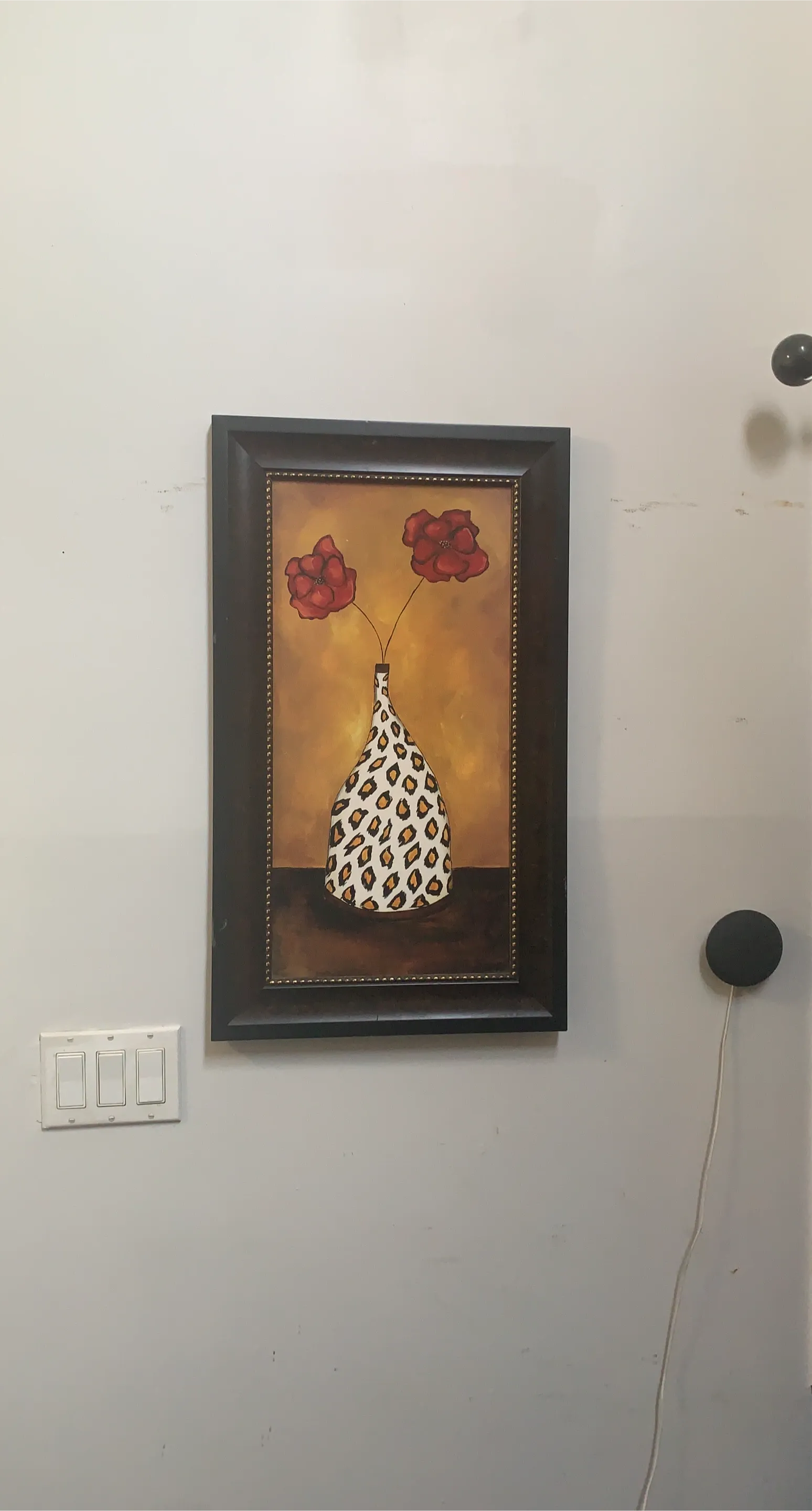 This framed wall art see features a decorative vase with two red flowers. The vase design in one includes a leopard print pattern and the other a zebra print pattern. It's ready to hang and adds a unique touch to your decor.