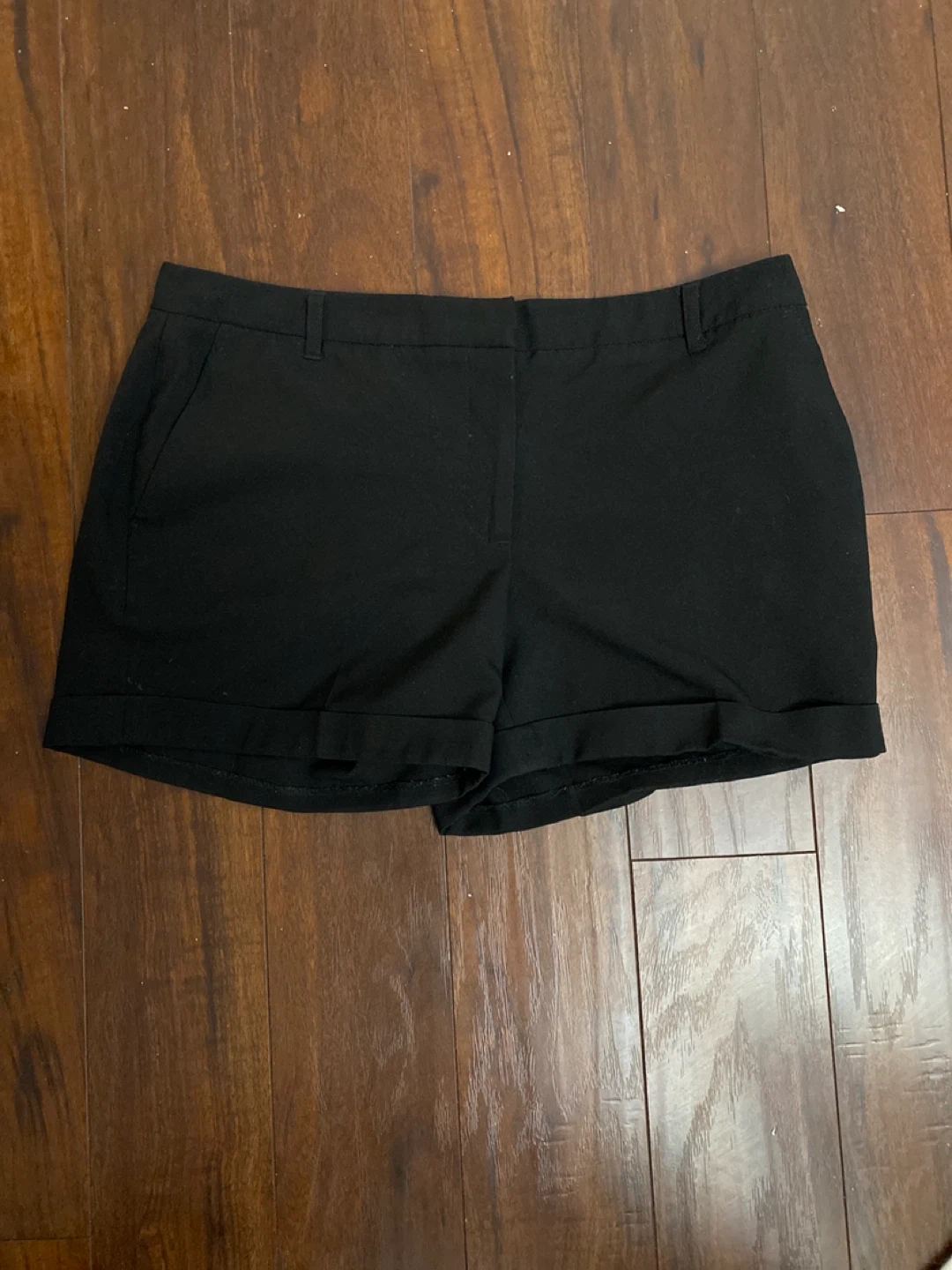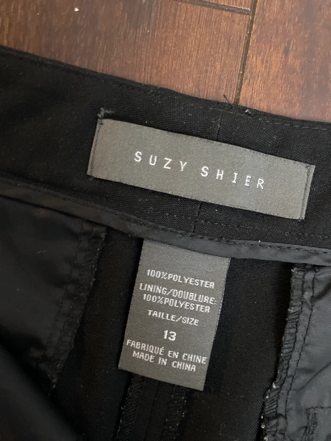 These Suzy Shier shorts are black and made from 100% polyester. They're a size 13 with a cuffed hem. These shorts are great for a casual outing or dressing up slightly.