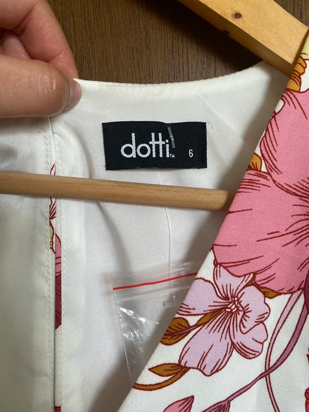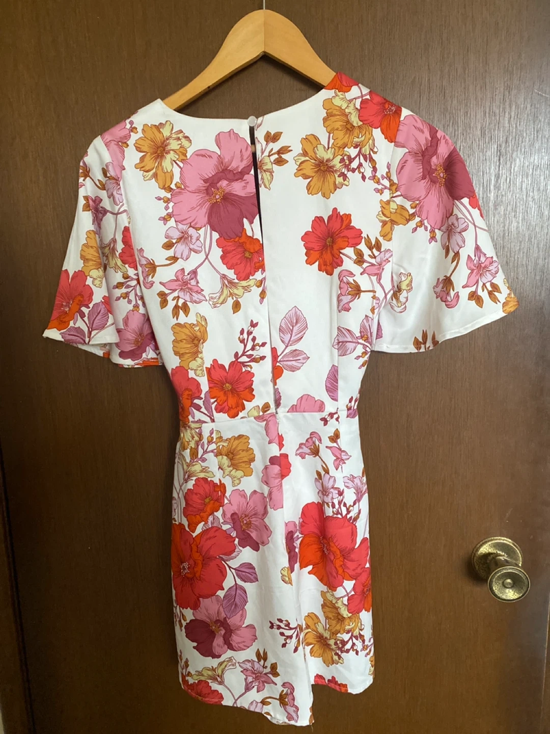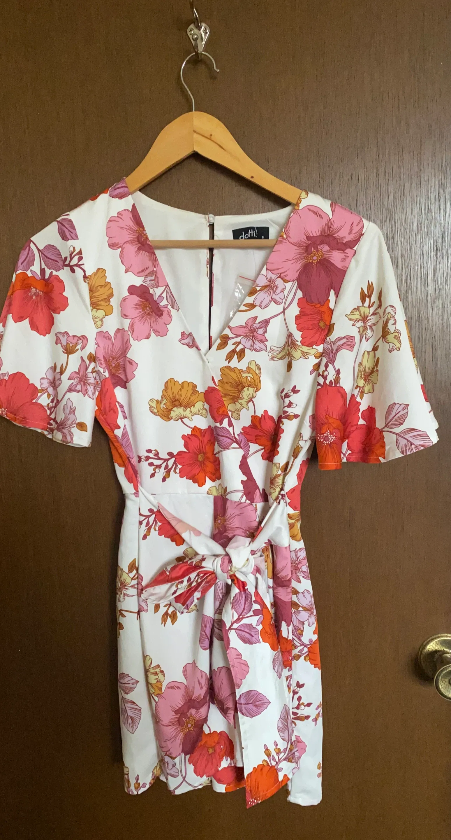Selling a White Dotti dress featuring a vibrant floral print with shades of pink, red, and orange. It's a size 6 with short flutter sleeves and a tie waist, has a zipper at the back. This dress is perfect for warmer weather occasions! Rarely worn