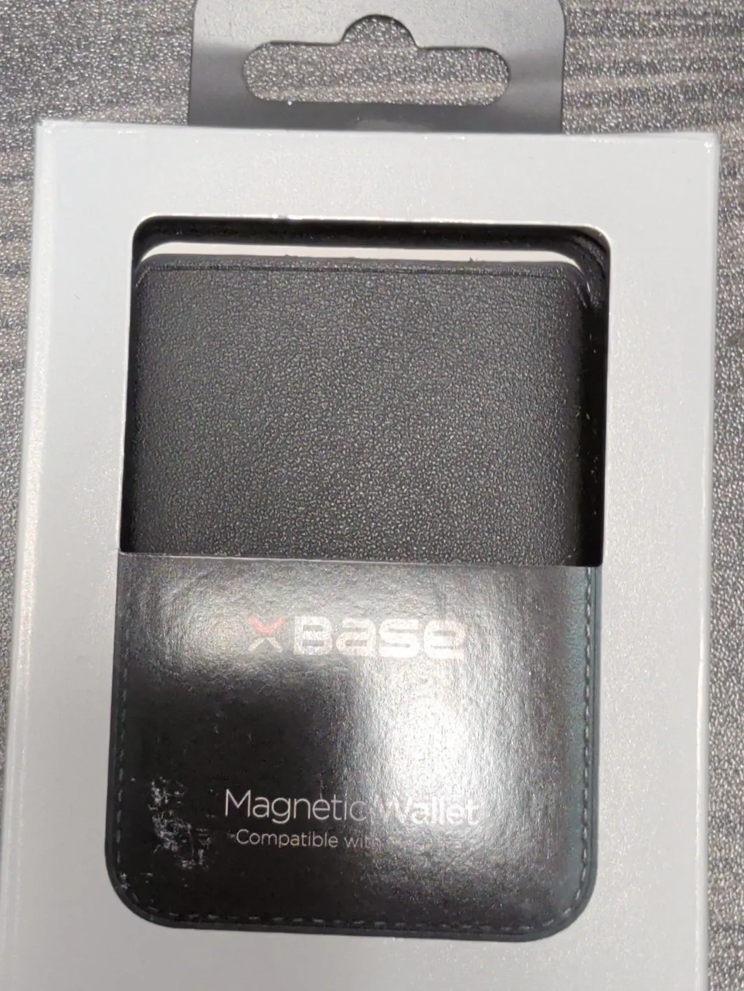 This is an XBase magnetic wallet. It's compatible with most phones. The wallet is black and made of a textured material. Includes original packaging.