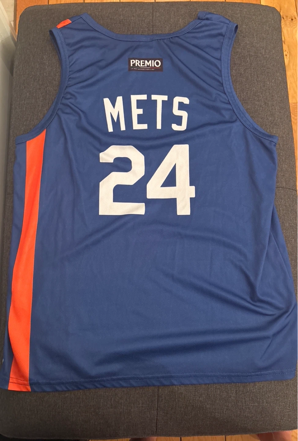 This is a New York Mets jersey featuring the number 24. It has "Mets" on the front and "New York" above the number. The back has "Mets" and the number 24. "Premio" is visible on the back collar. It's blue with orange and white accents on the sides.