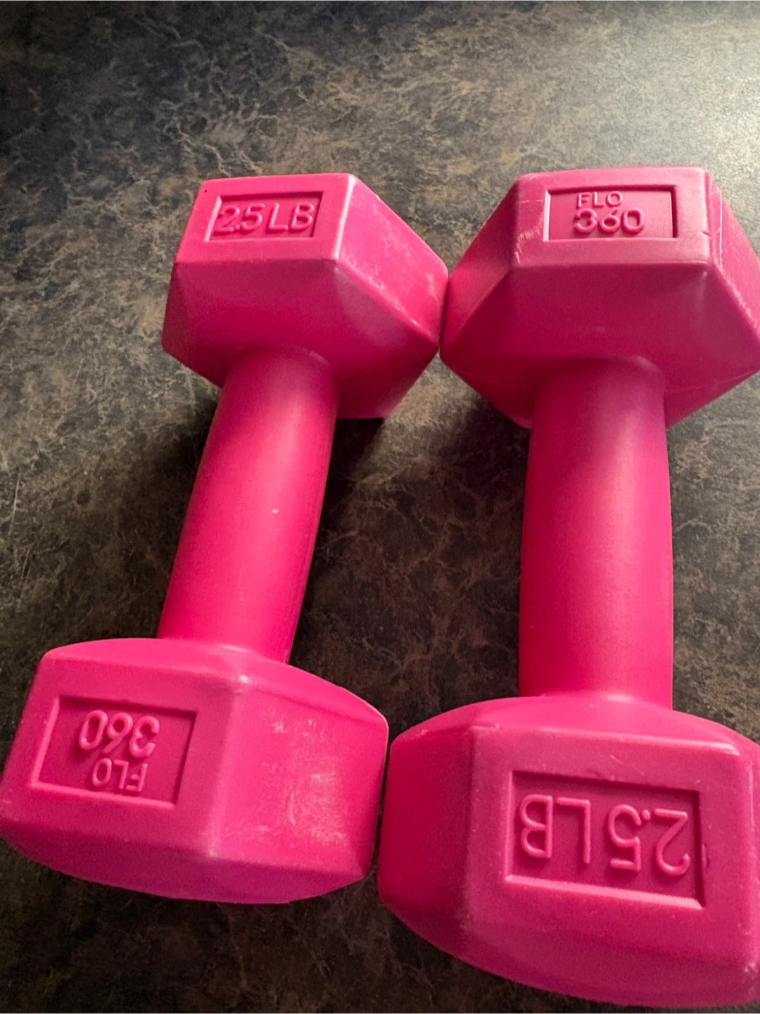 This is a pair of bright pink dumbbells, each weighing 2.5 LB. They have hexagonal ends to prevent rolling. These are great for light workouts or toning exercises!