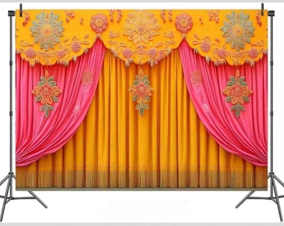 Decorative backdrop featuring yellow and pink drapes with intricate floral embellishments. It's designed to add a vibrant touch to events. The fabric is polyester.