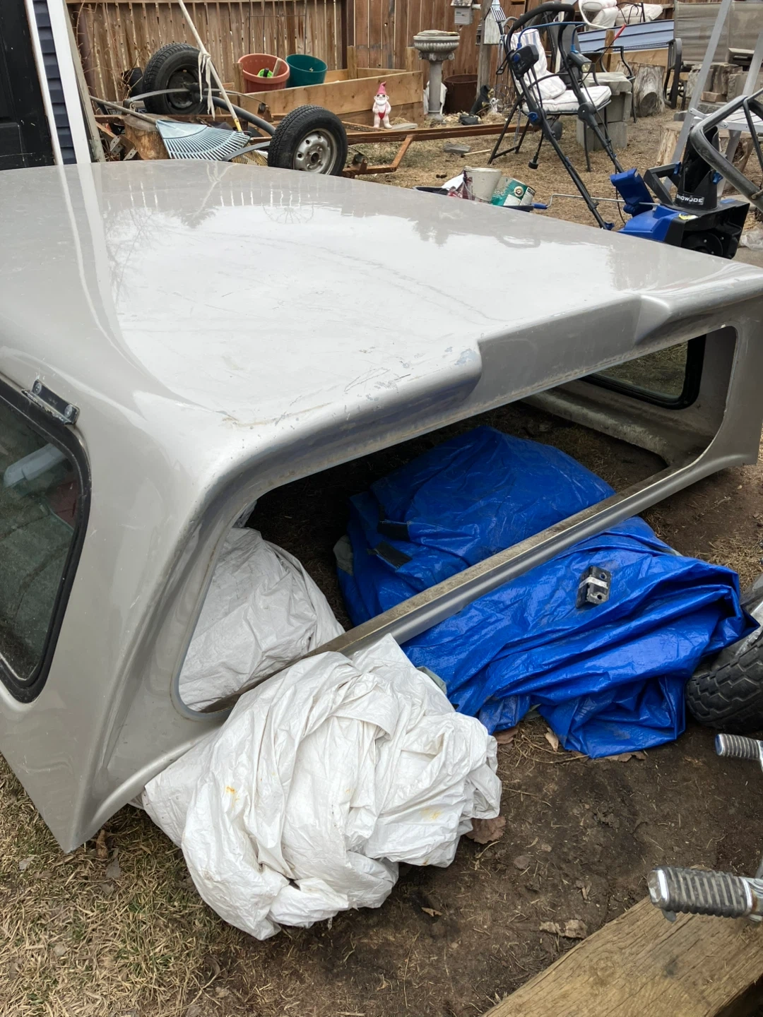 This is a silver truck cap, likely for a full-size pickup. It has tinted side windows and a top brake light. Some wear and tear is visible on the exterior. There is no window in the back and on the other back only the two sides have windows free. Size 5 x 7.