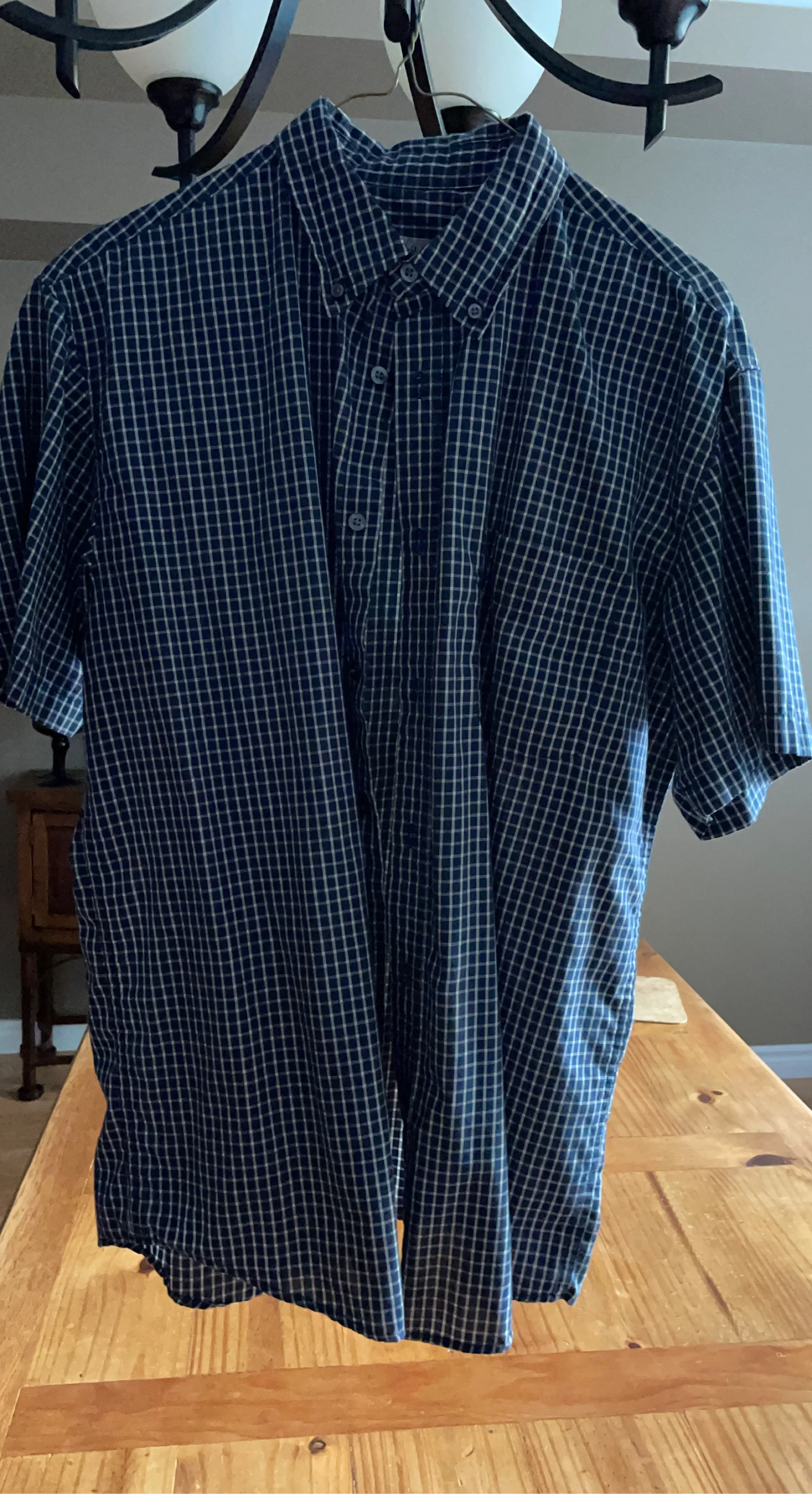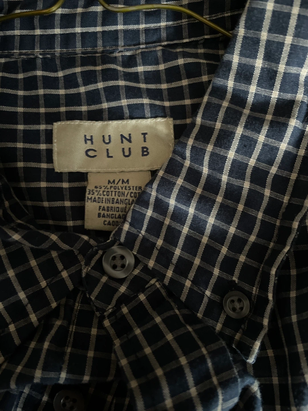 This is a Hunt Club men's short sleeve button-up shirt. It's a medium/M size with a classic plaid pattern in navy and white. The fabric is a blend of 65% polyester and 35% cotton. This shirt is perfect for casual everyday wear.