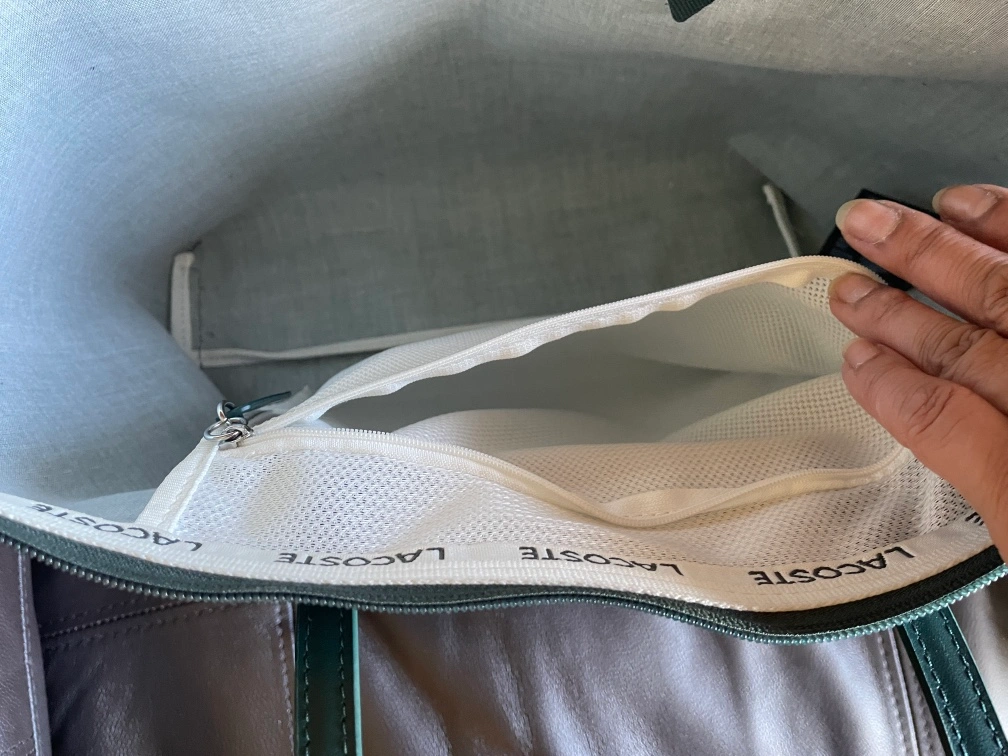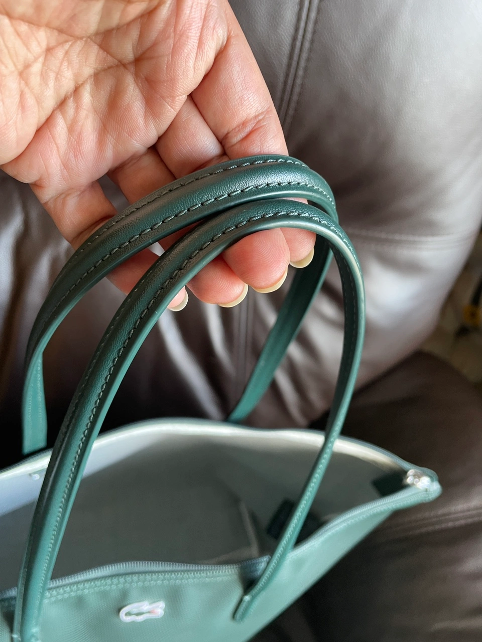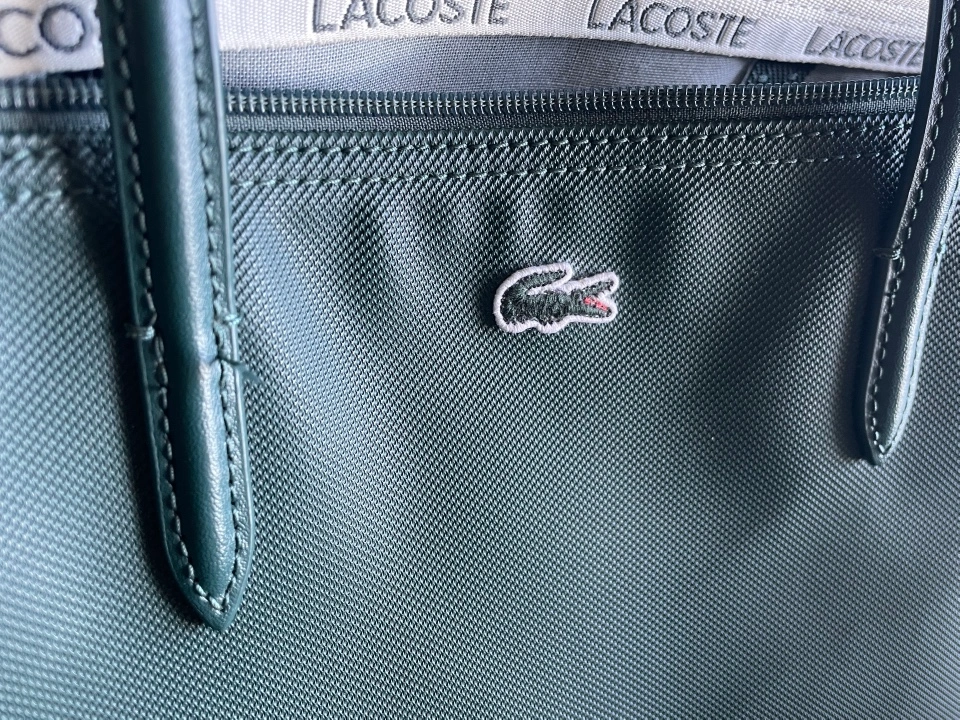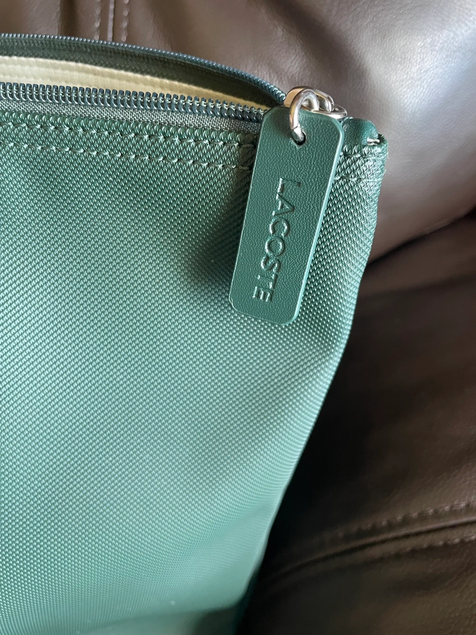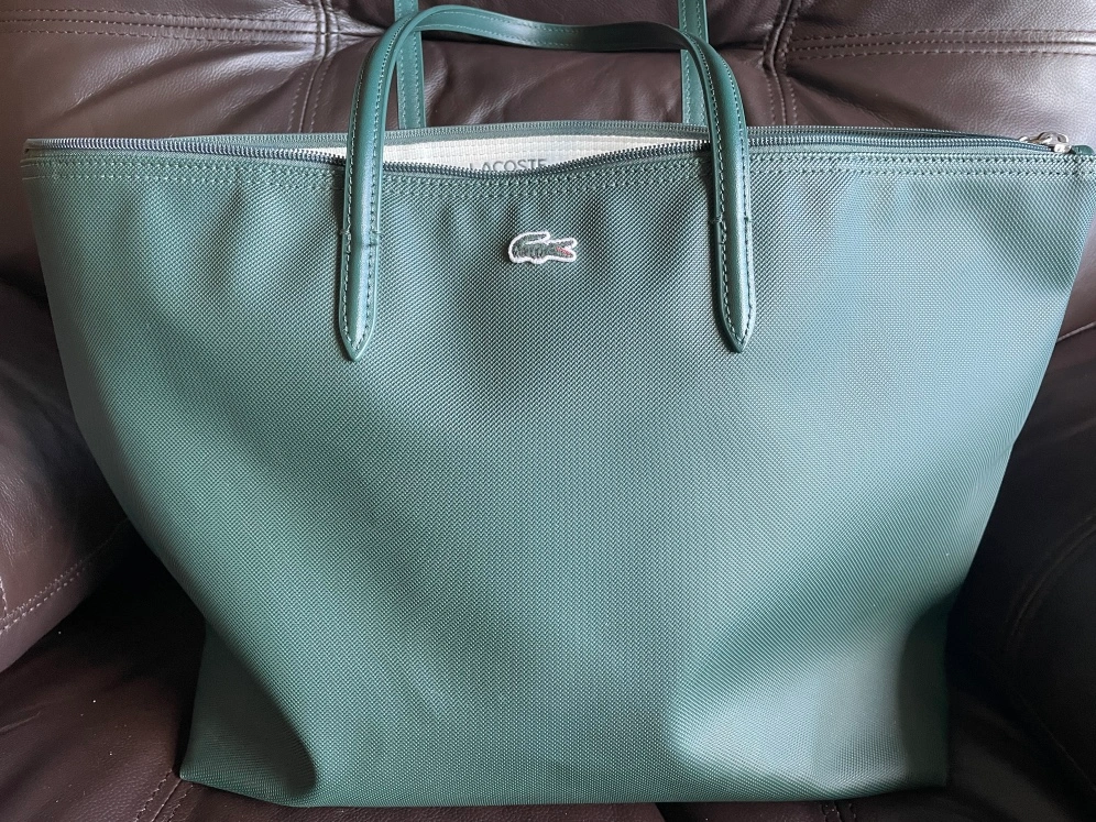 Authentic Lacoste tote bag with long handles and an interior pocket provide a practical touch. Shows signs of daily wear but still has lots of life. Minor scuffs on the exterior and a bit of thread is loose on the handle. Purchased from Lacoste store in Metrotown. See photos for reference. This is a nice every day bag.