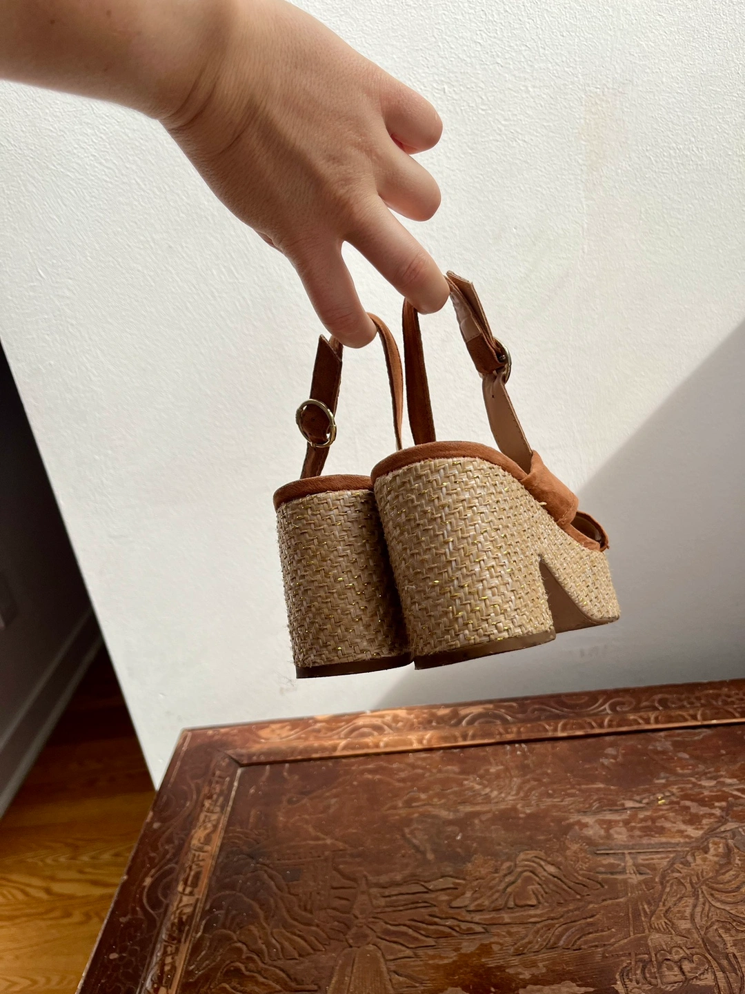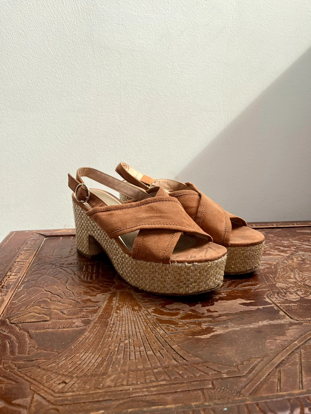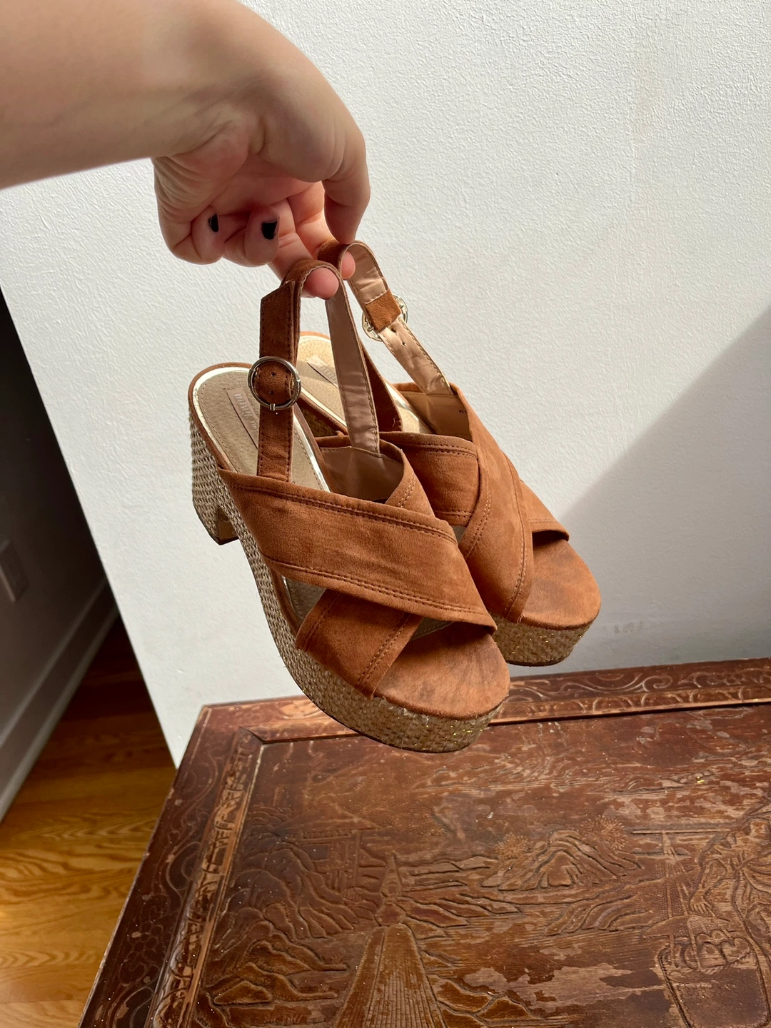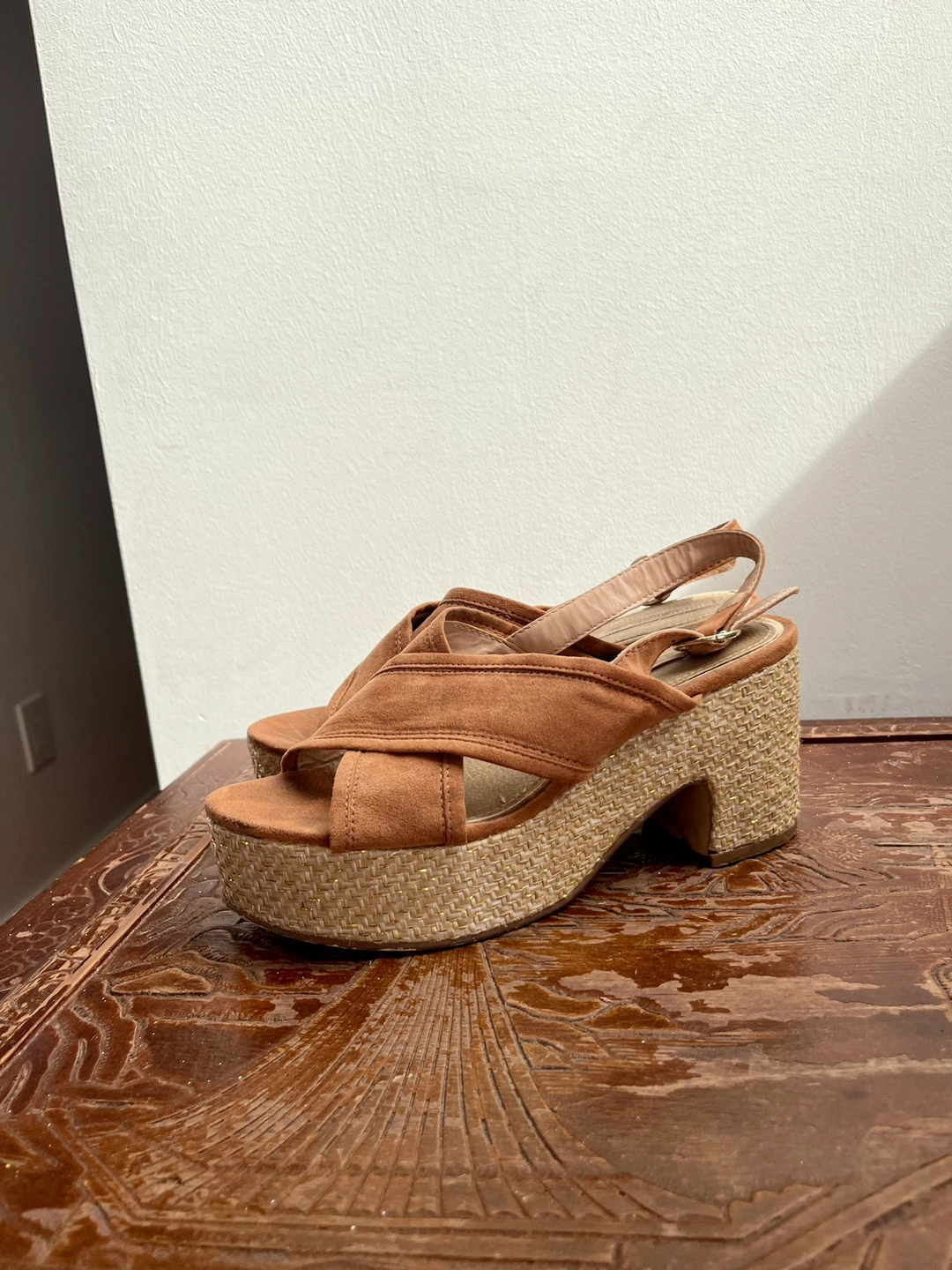 Confortable sandals made out of fake suede, real leather inner sole and wicker heels.