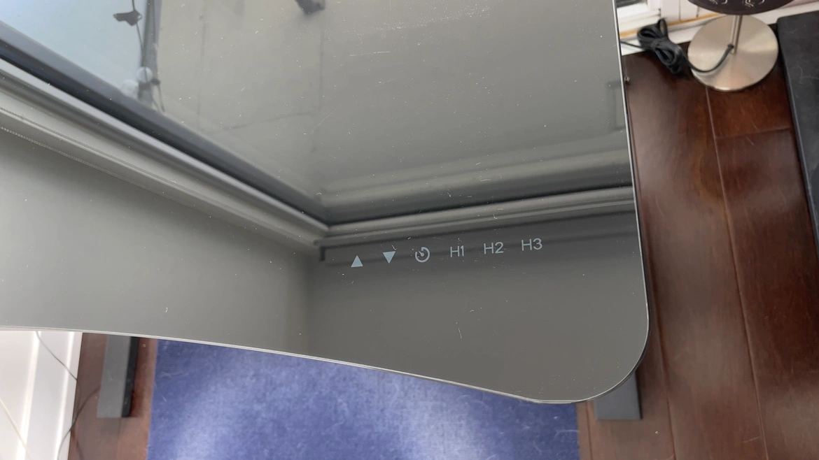 The desk has a top glass (with one little scratch visible in one of the pictures), with touch buttons for height adjustments as well as 3 settings of heights and a timer. There are 3 usb ports on the right side of it as well as a physical button to lock the touch button, avoiding any accidental changes.