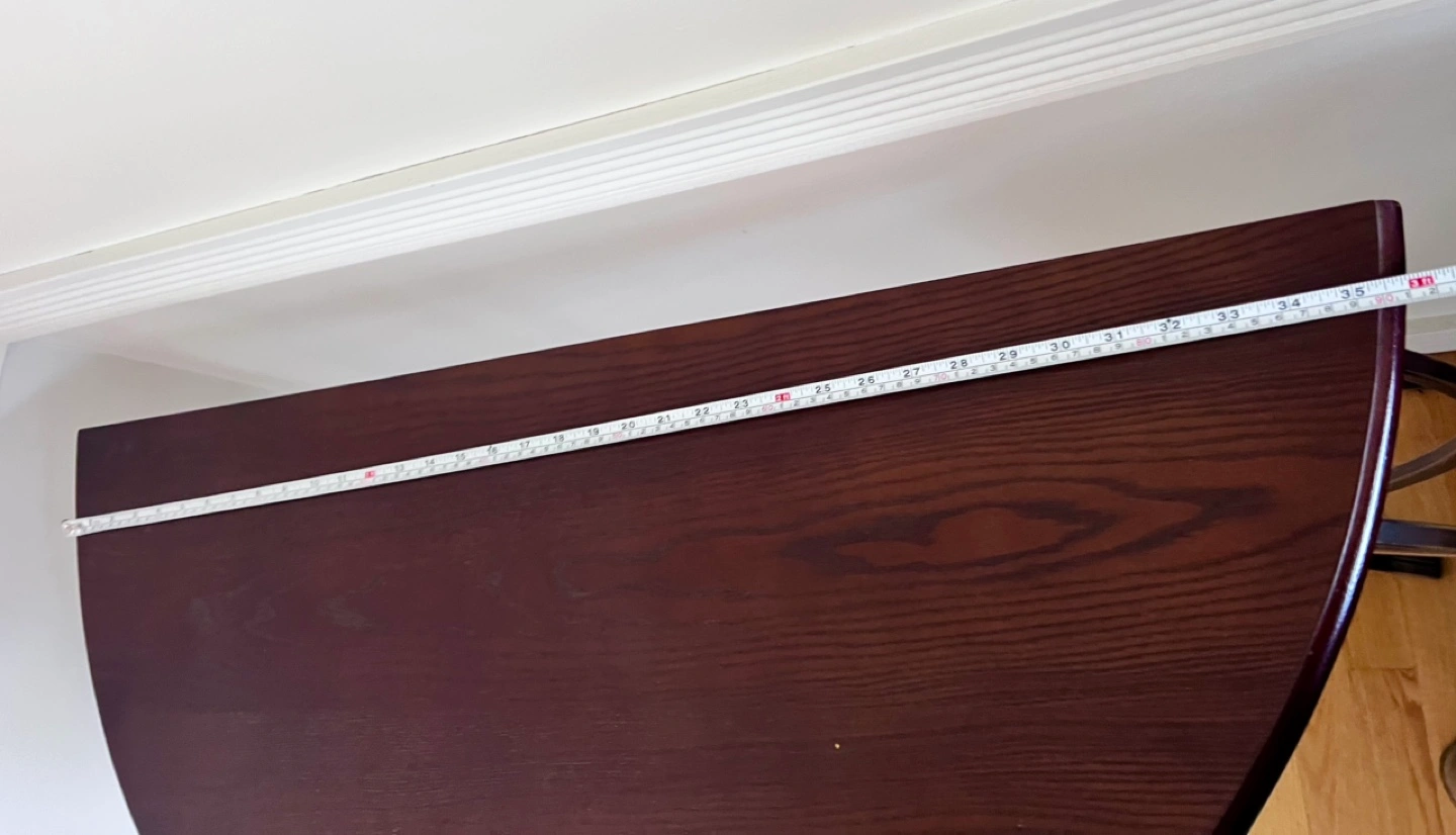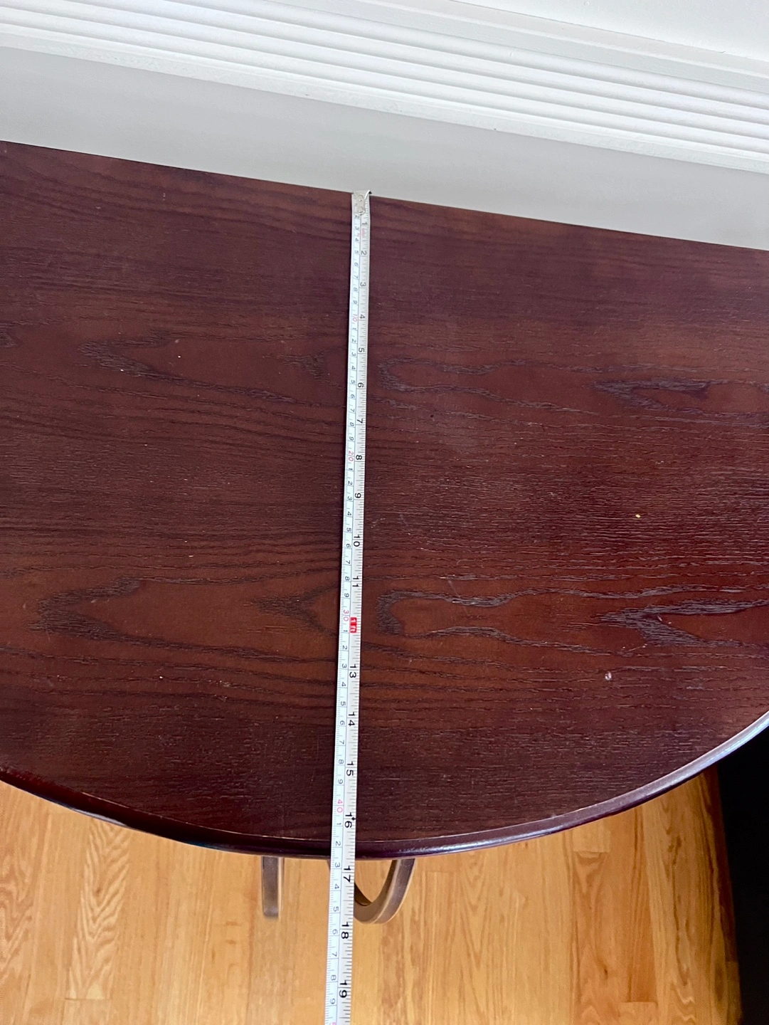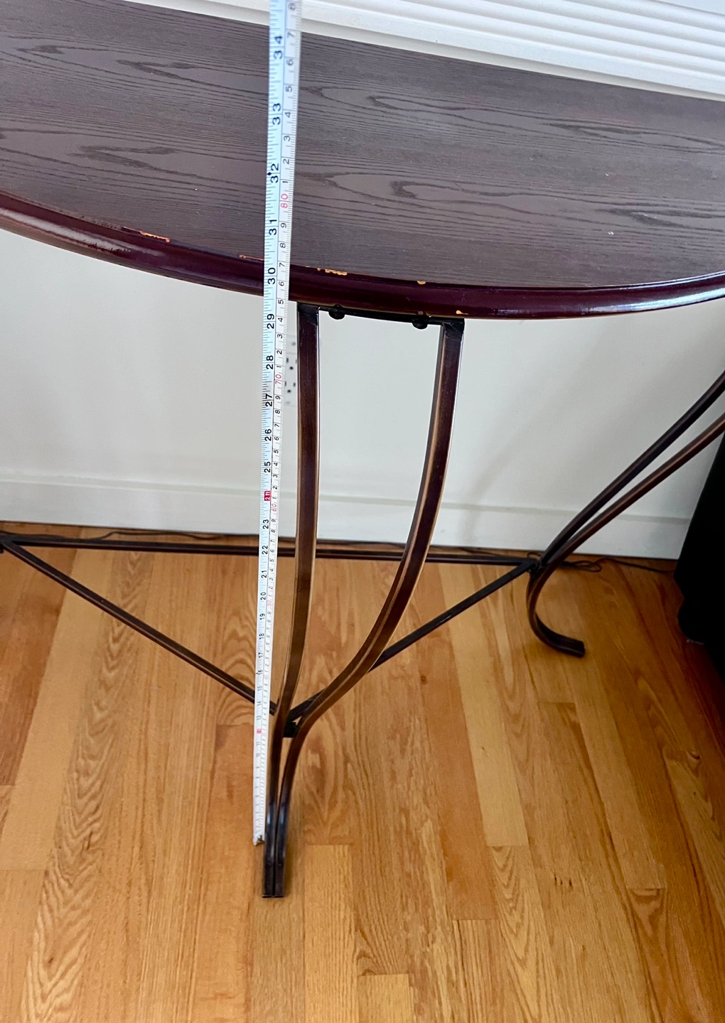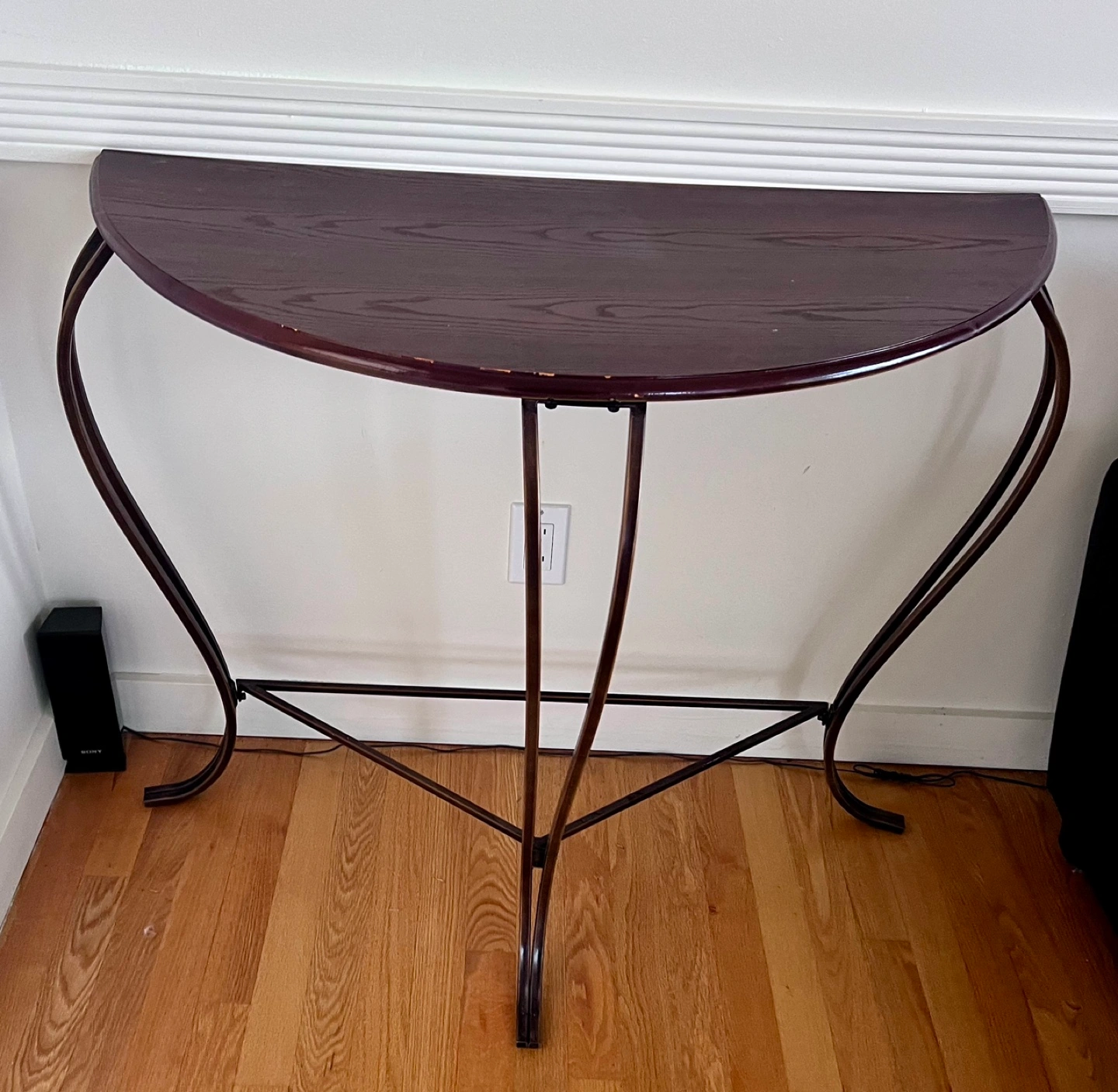 Dark brown half-moon shaped console table. Metal legs. Perfect for entrance or hallway.