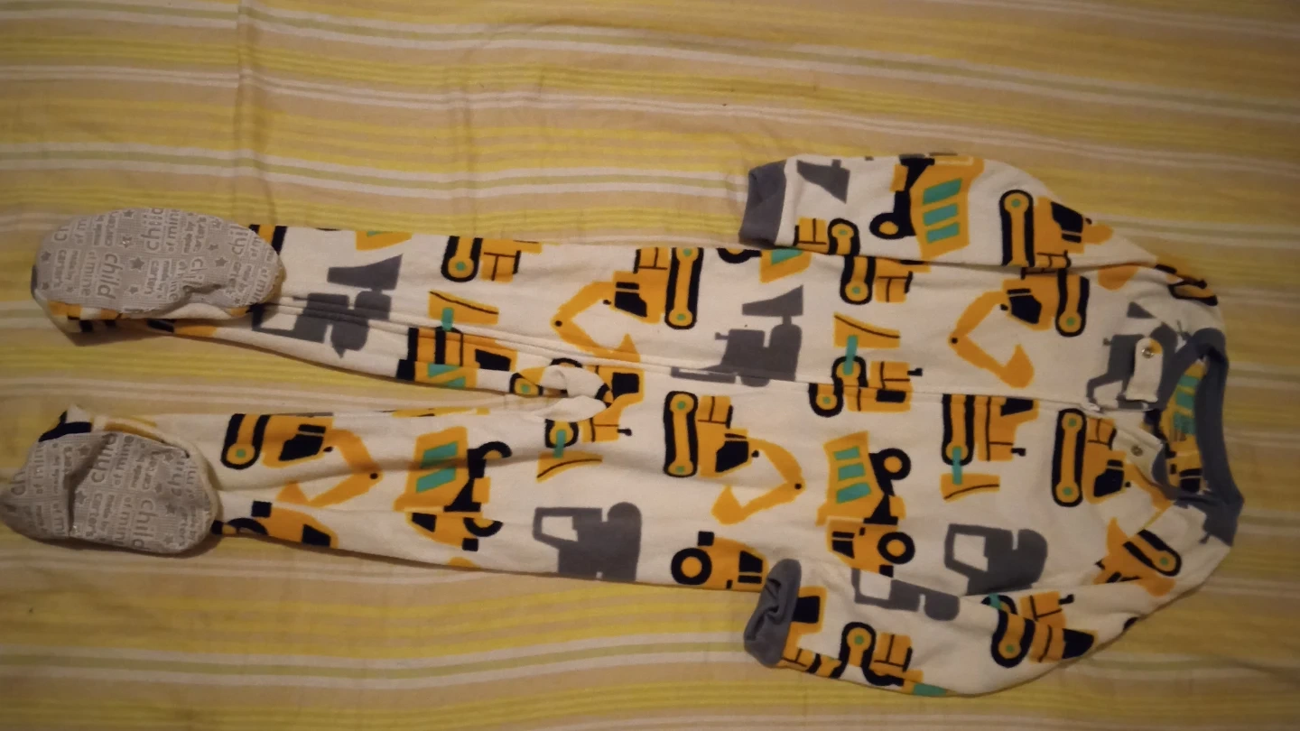 Cozy footed pajamas from Child of Mine by Carter's with a fun construction vehicle print. Features a zipper closure and non-slip grips on the feet. Made of soft fabric for comfortable sleep.