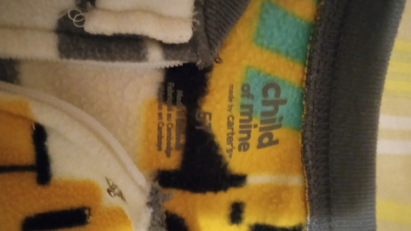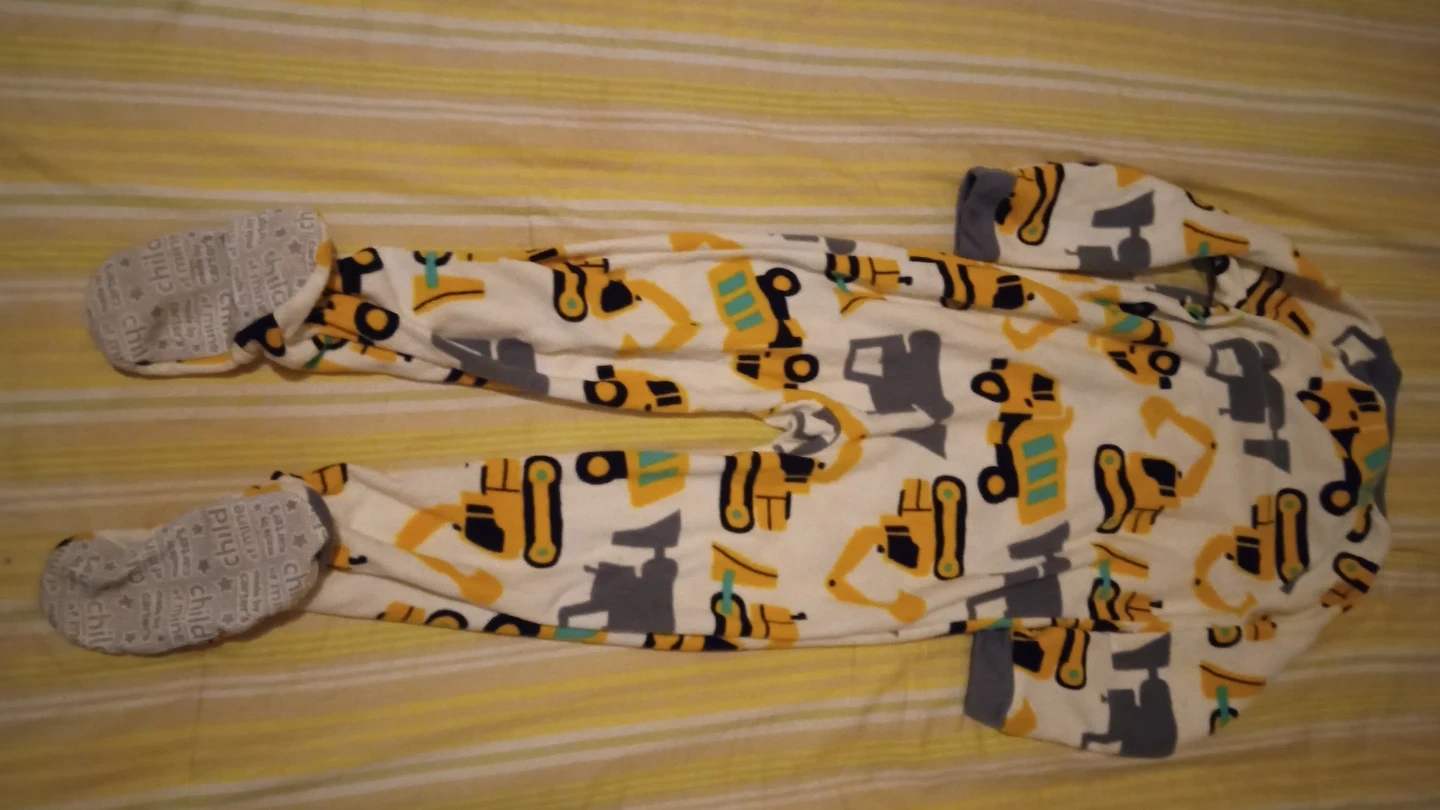 Cozy footed pajamas from Child of Mine by Carter's with a fun construction vehicle print. Features a zipper closure and non-slip grips on the feet. Made of soft fabric for comfortable sleep.
