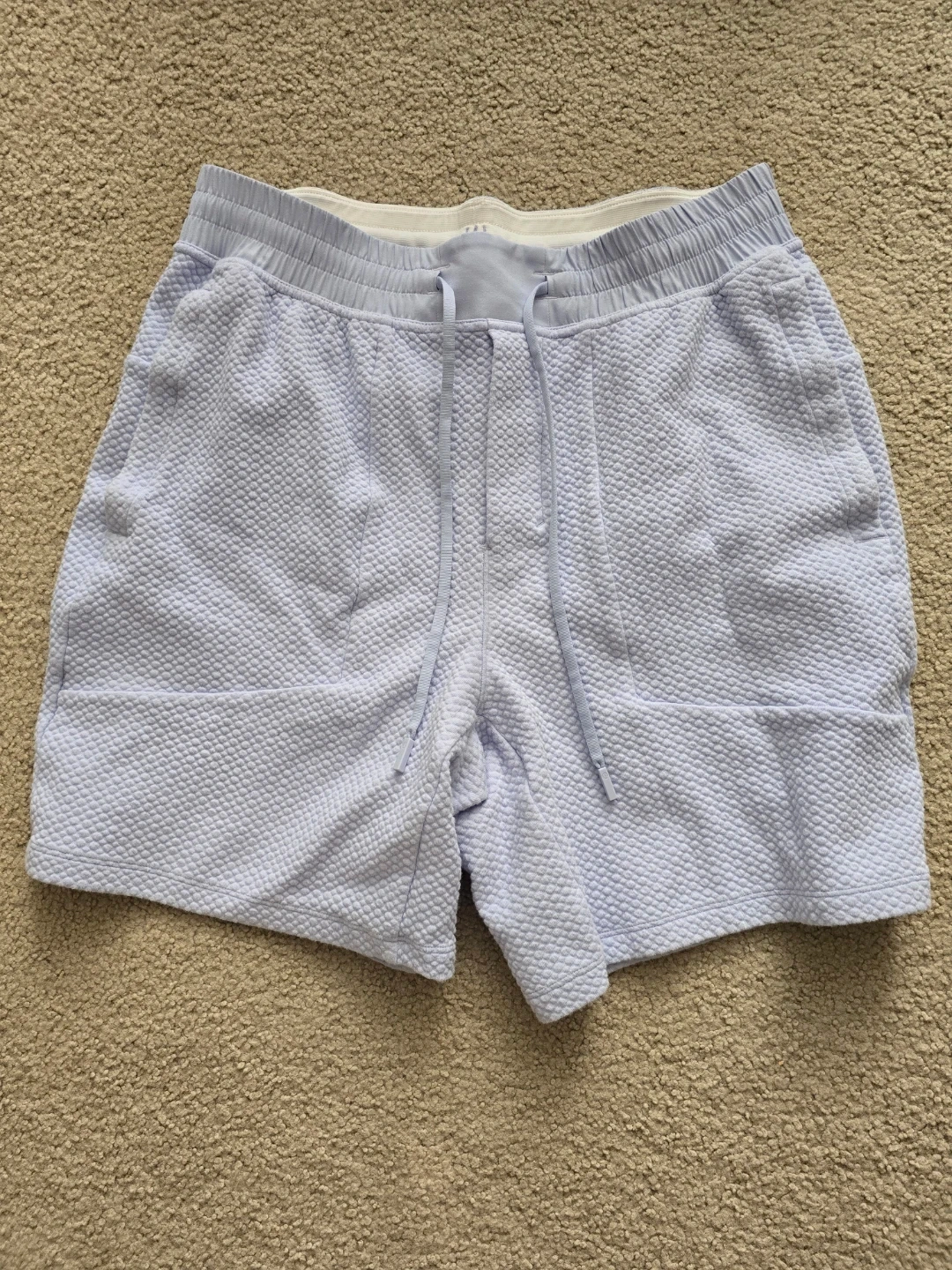 Light blue athletic shorts with a textured fabric. These shorts feature an elastic waistband with a drawstring for a comfortable fit. Pockets are on the sides. Great for workouts or lounging!