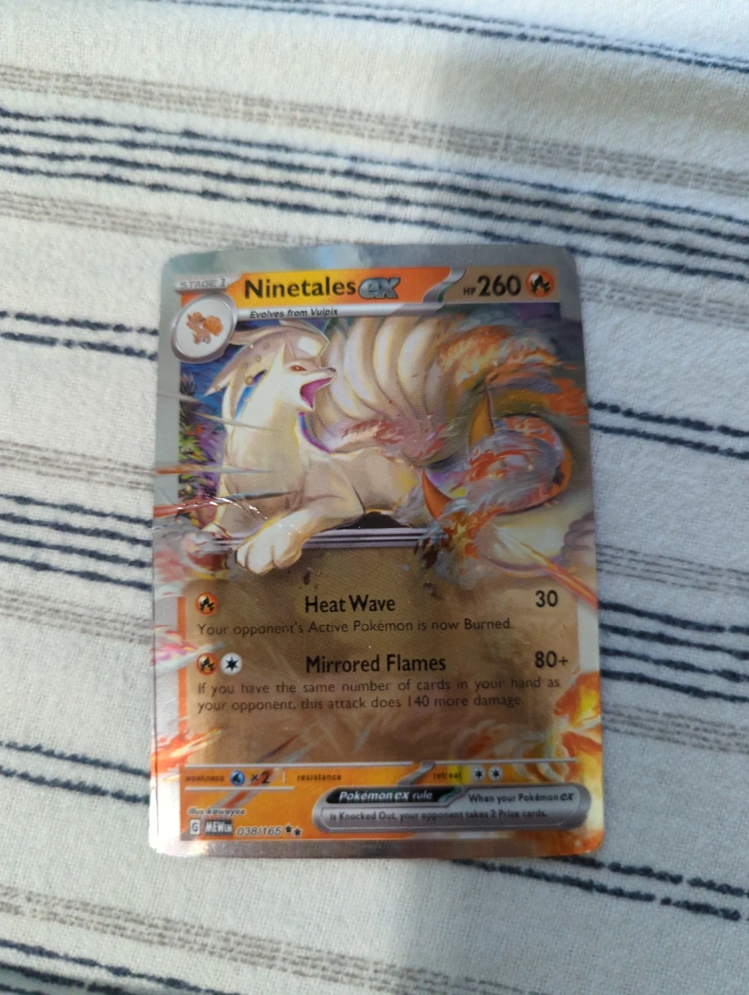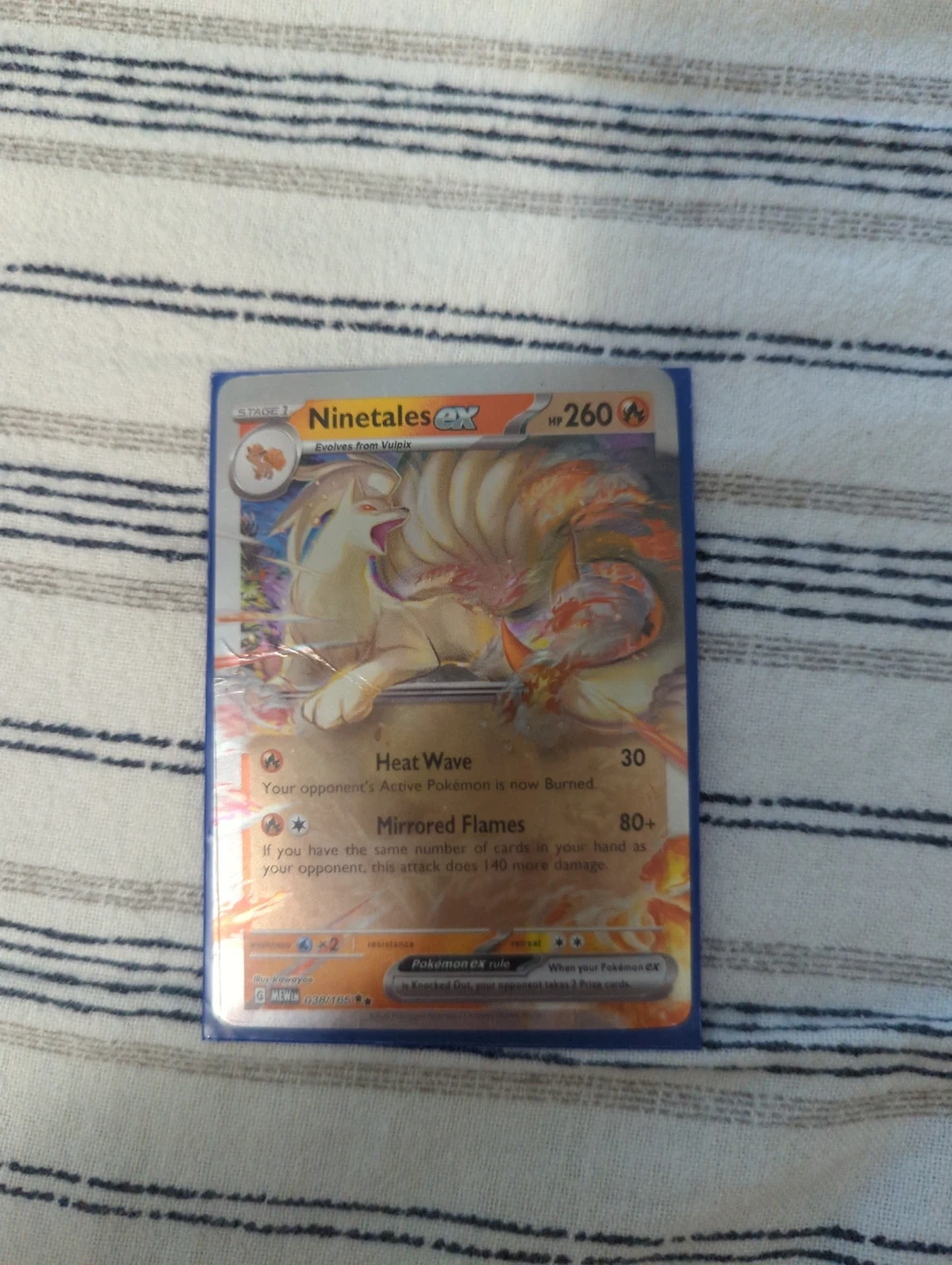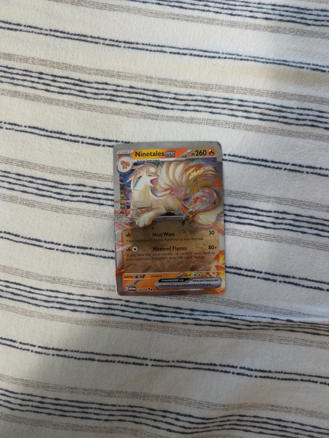 This is a Pokemon Ninetales EX trading card. It's a stage 1 card with 260 HP. It has attacks called Heat Wave and Mirrored Flames.Also comes with a sleeve to keep card safe!