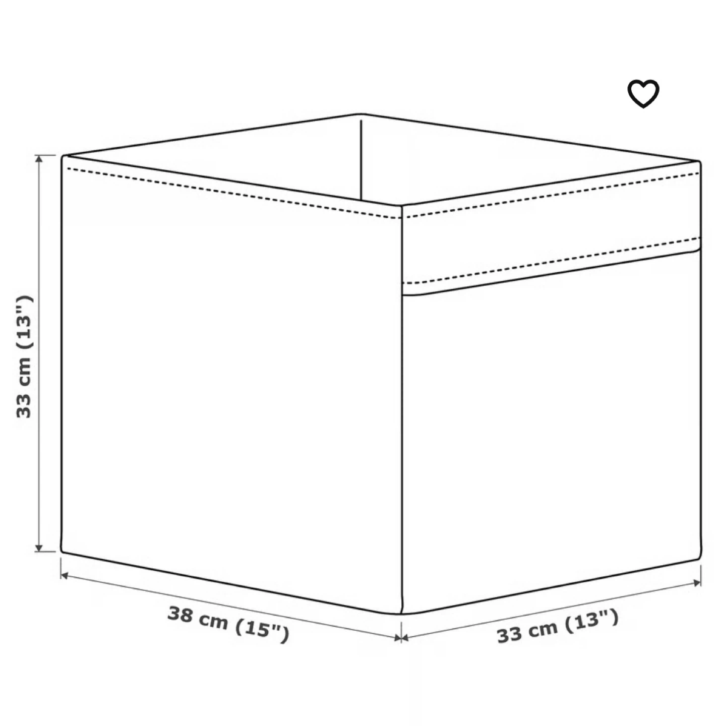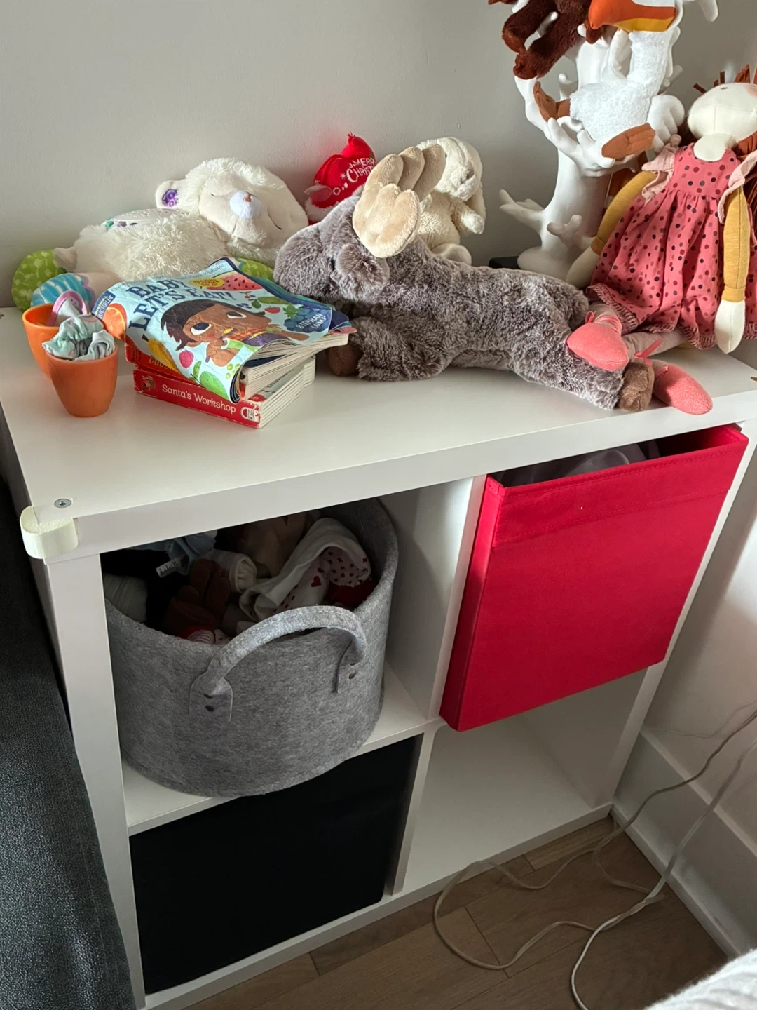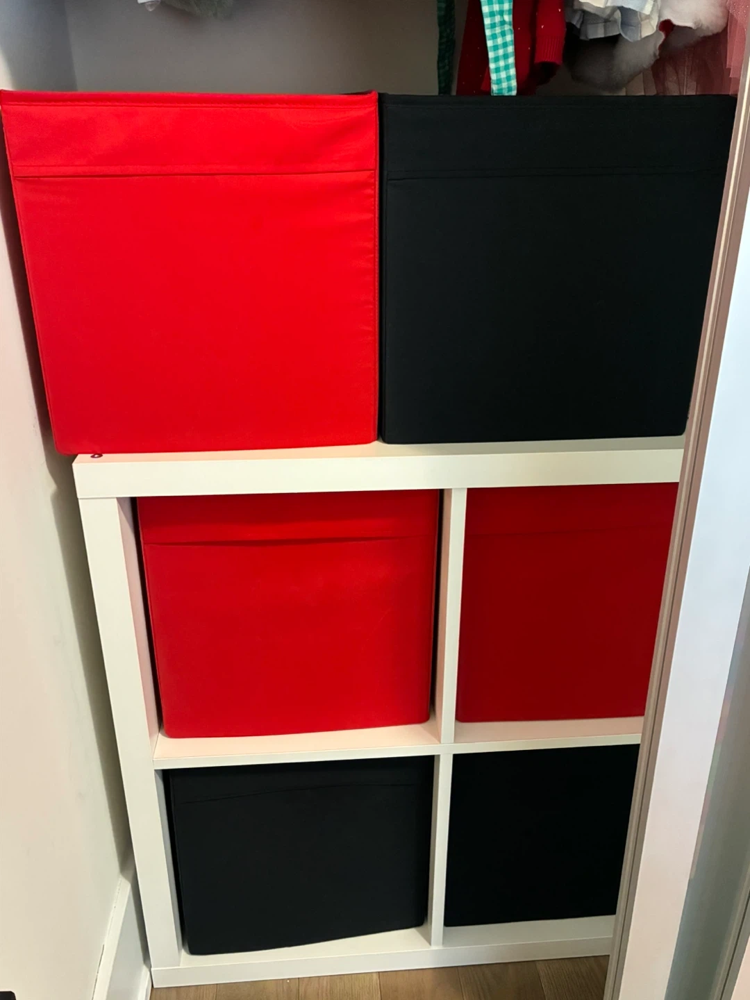 2 shelving units available. Red and white storage boxes included. Grey basket not included.