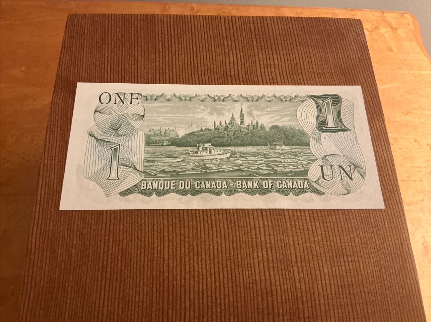 This is a Canadian $1 banknote issued by the Bank of Canada in 1973 from the “Scenes of Canada” series. The front features Queen Elizabeth II and the Coat of Arms. The reverse depicts the Parliament Buildings in Ottawa and a tugboat on the Ottawa River. Pristine, uncirculated condition.