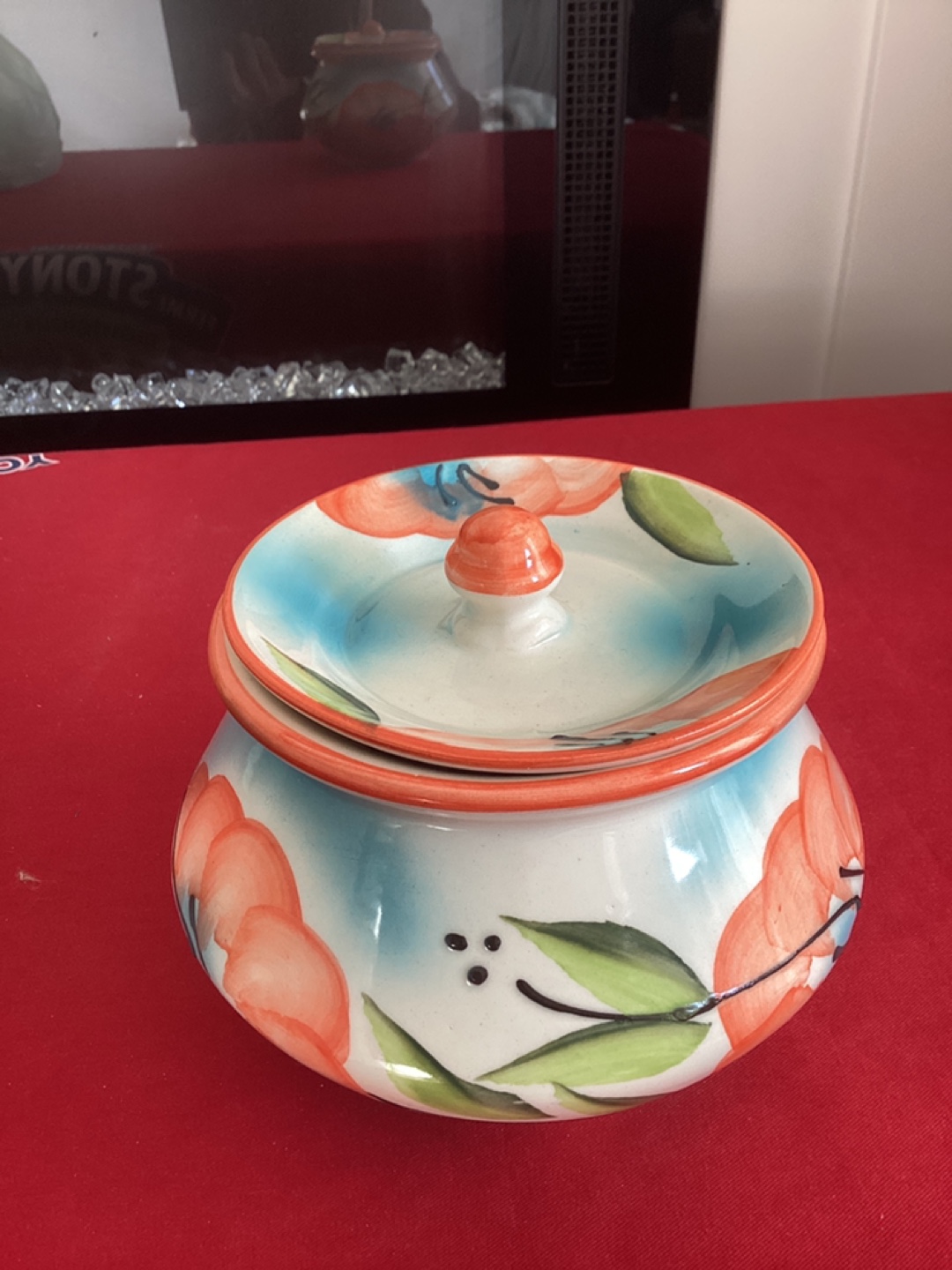 Ceramic jar with lid. Hand-painted with floral design. Brand new