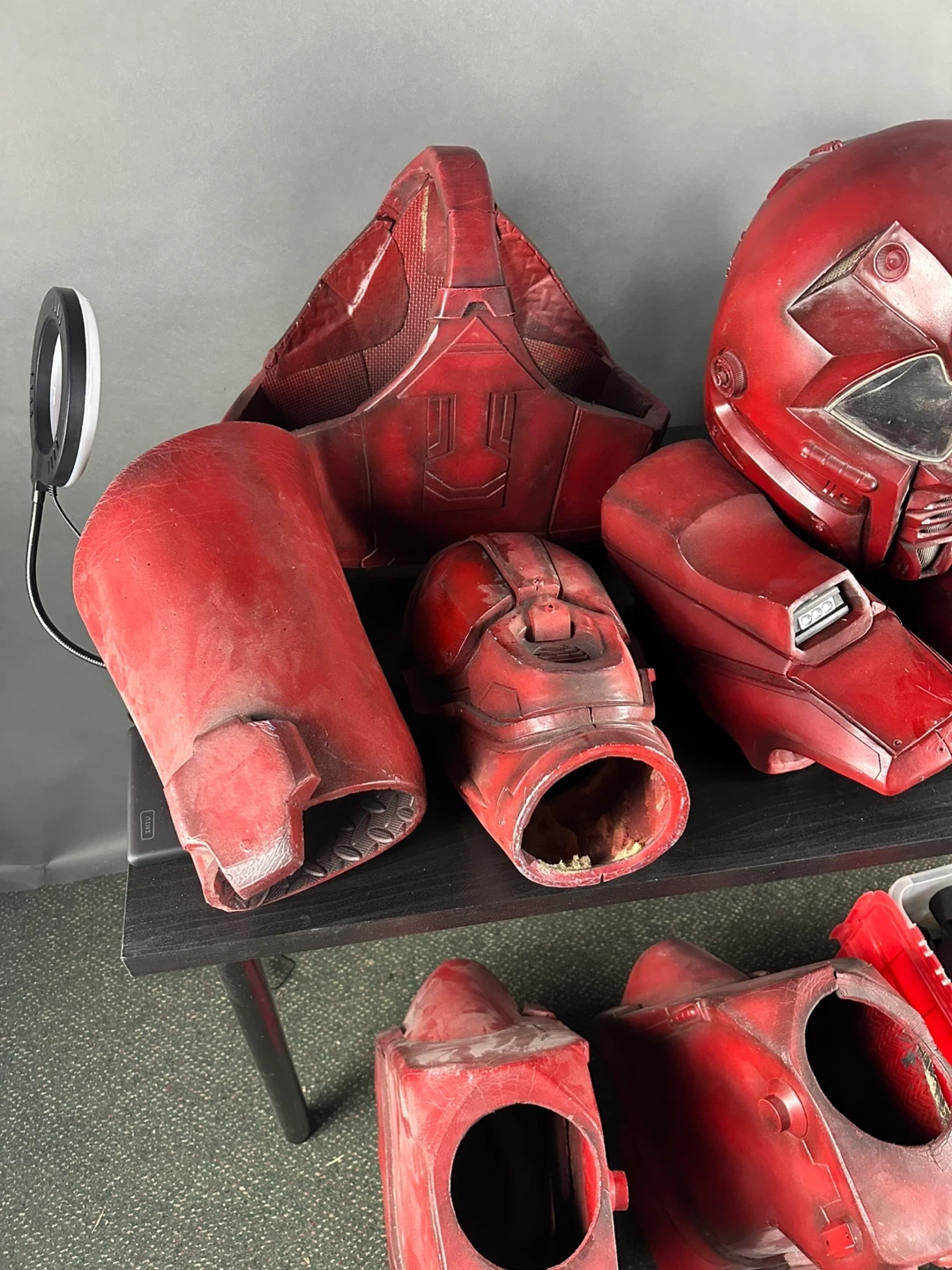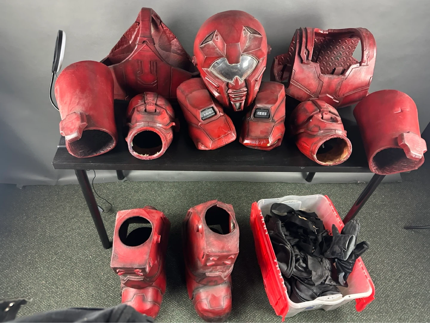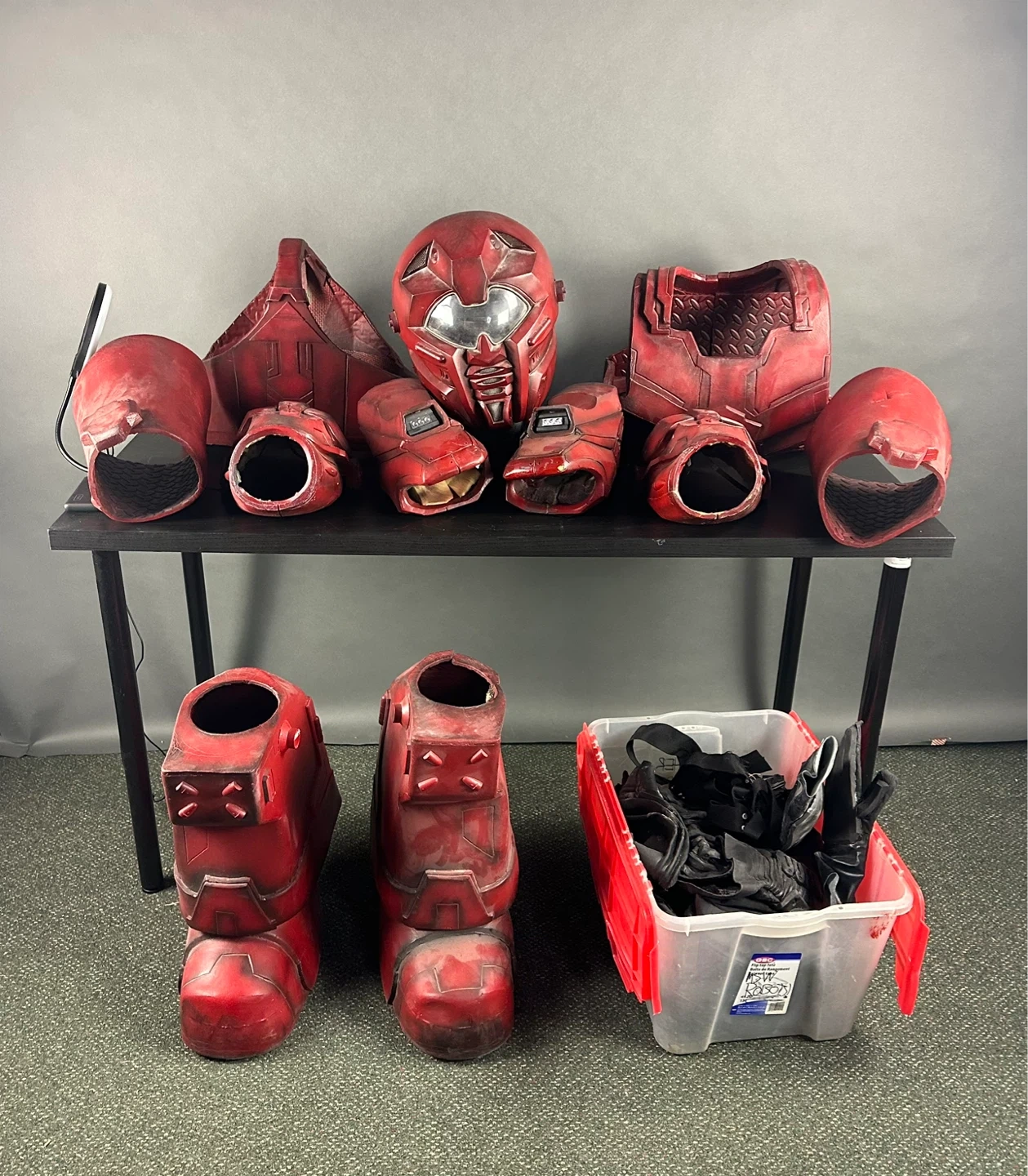 This is a full red body armour set. It includes a helmet, chest piece, arm guards, leg guards, and a bin of accessories. The costume is made of a durable material and has a worn, battle-ready finish.