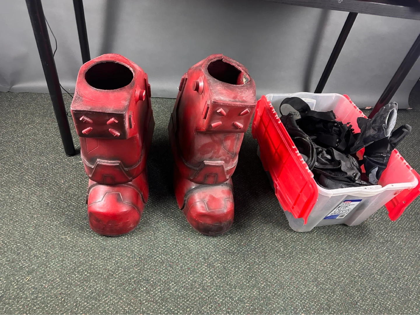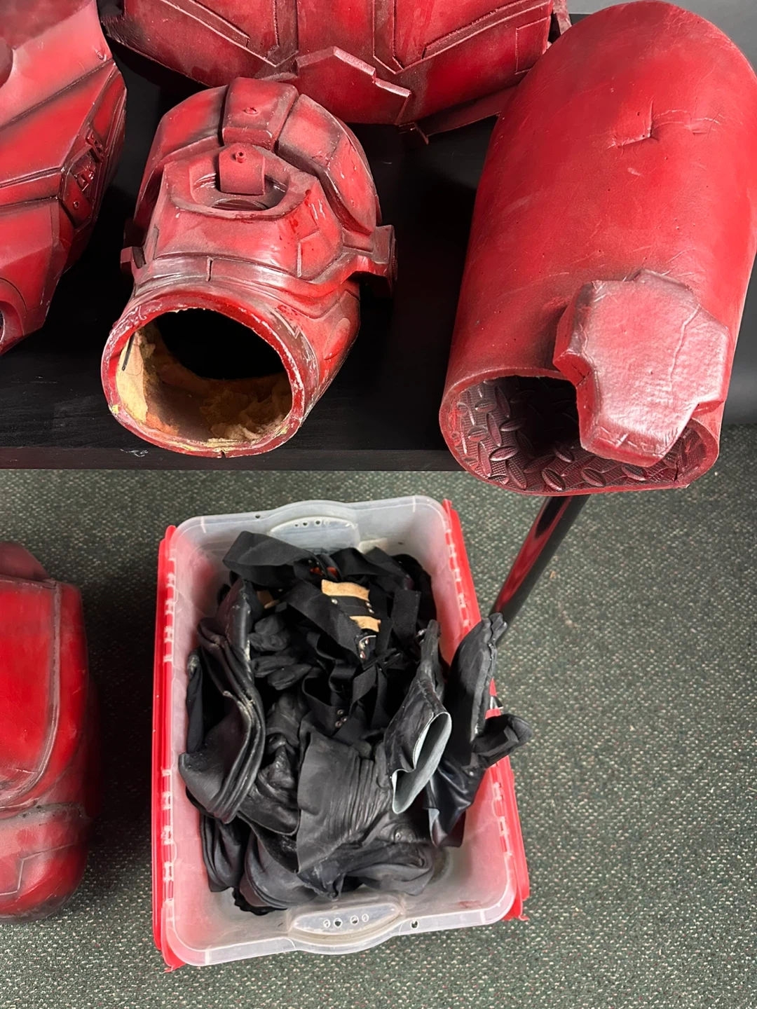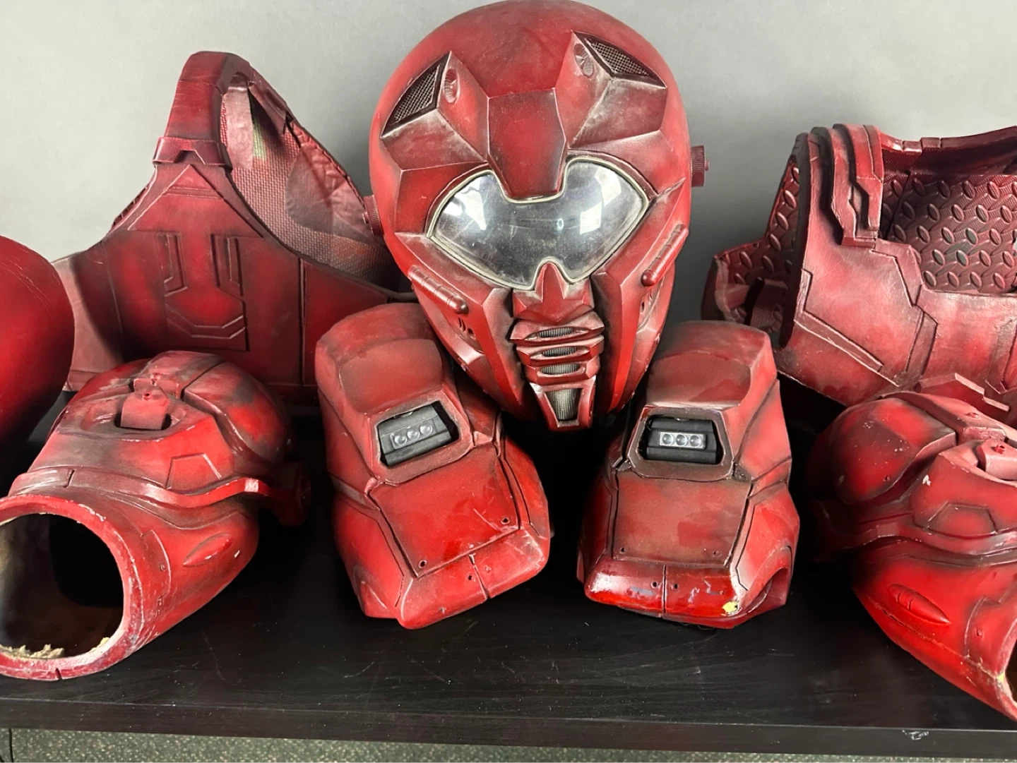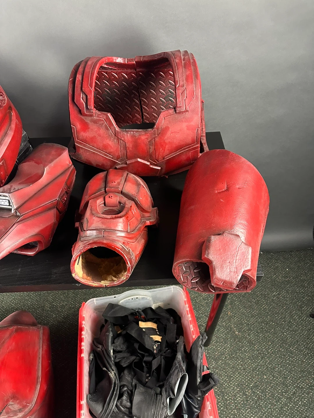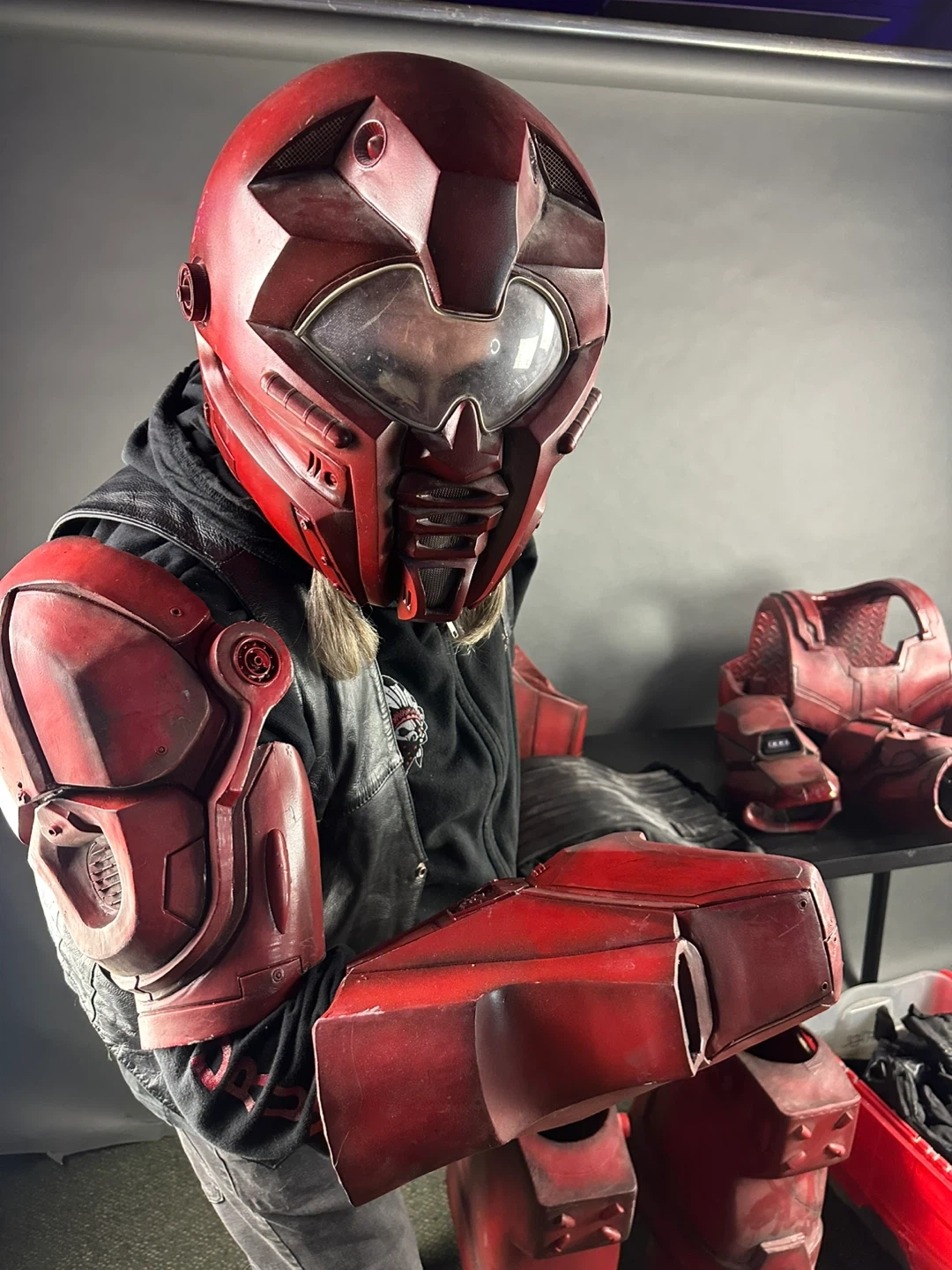 This is a full red body armour set. It includes a helmet, chest piece, arm guards, leg guards, and a bin of accessories. The costume is made of a durable material and has a worn, battle-ready finish.