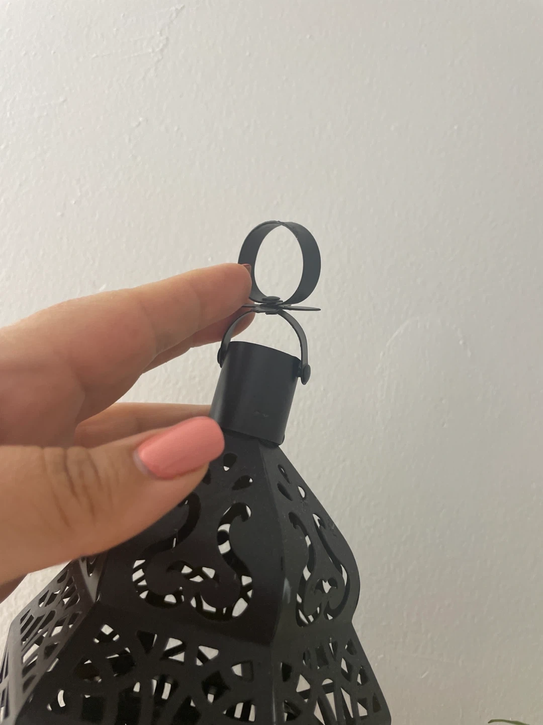 Black metal lantern with ornate cutouts.