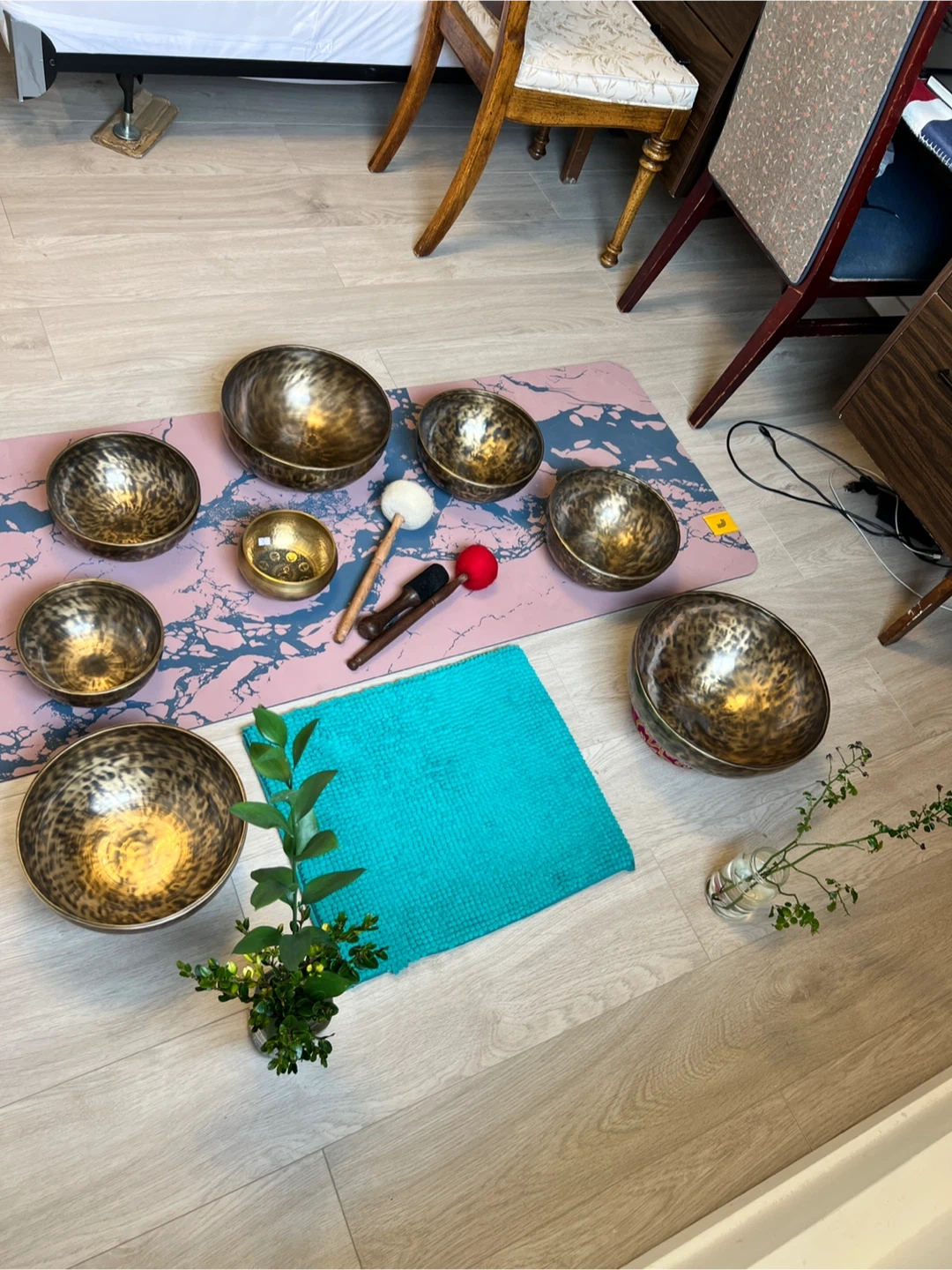 This set includes seven Tibetan singing bowls in various sizes, along with two mallets and a small striker. They're crafted from metal with an aged bronze finish and feature intricate embossed patterns. These bowls are perfect for meditation and sound healing practices.it has 7 different frequencies to heal 7 chakra of the body…
