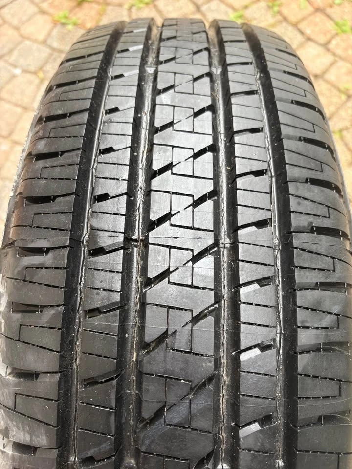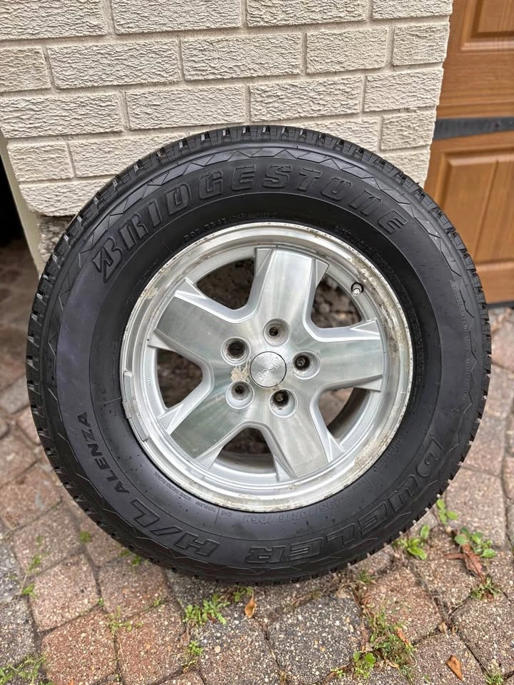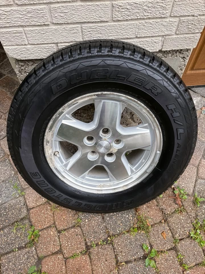 Selling a single Bridgestone Dueler H/L 235/70R16 on a Jeep aluminum wheel with a 5x114.3 bolt pattern and TPMS. Tire was a spare on the back of a Jeep Liberty its entire life. It was never used but has some cracking between the treads as seen in the photo. $80 for the one. Pick up near Pembina and the perimeter.