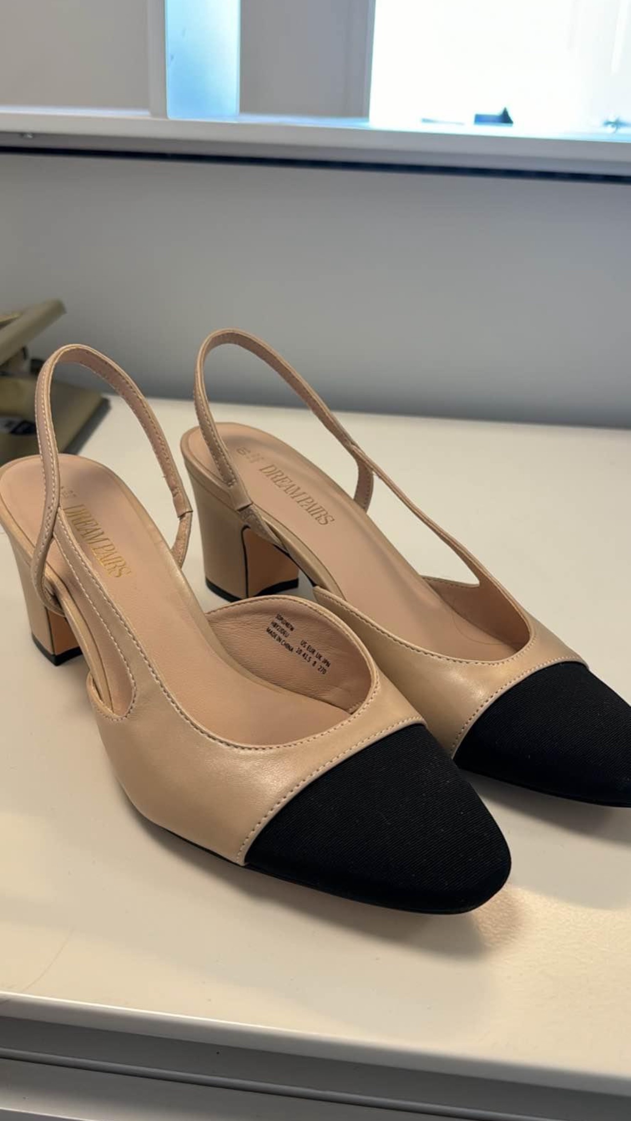 584Lovely pump shoes in cream and black toe color. I bought them from another seller, but they are too big for me. Just tried them on.
