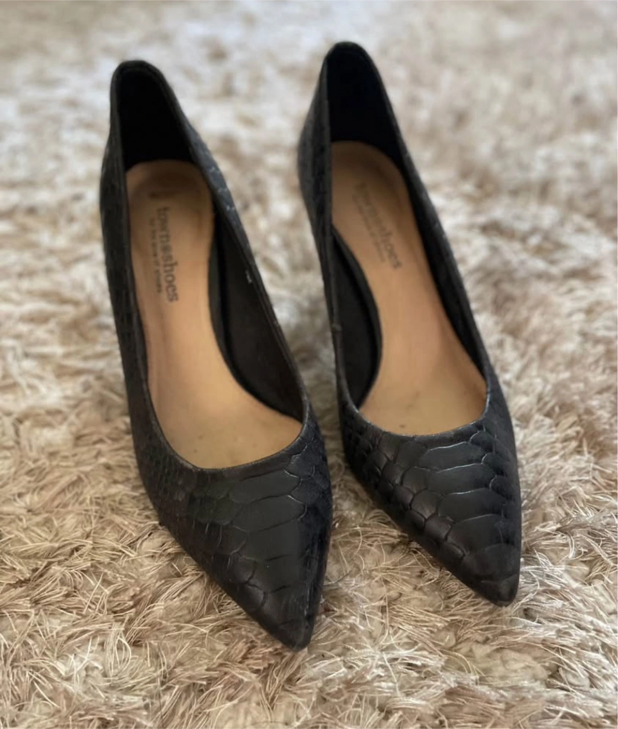 These black heels are from Town Shoes! They're a size 7 (37) and feature a genuine leather upper with leather lining and sock. They have a snakeskin-like pattern. Perfect for dressing up any outfit!