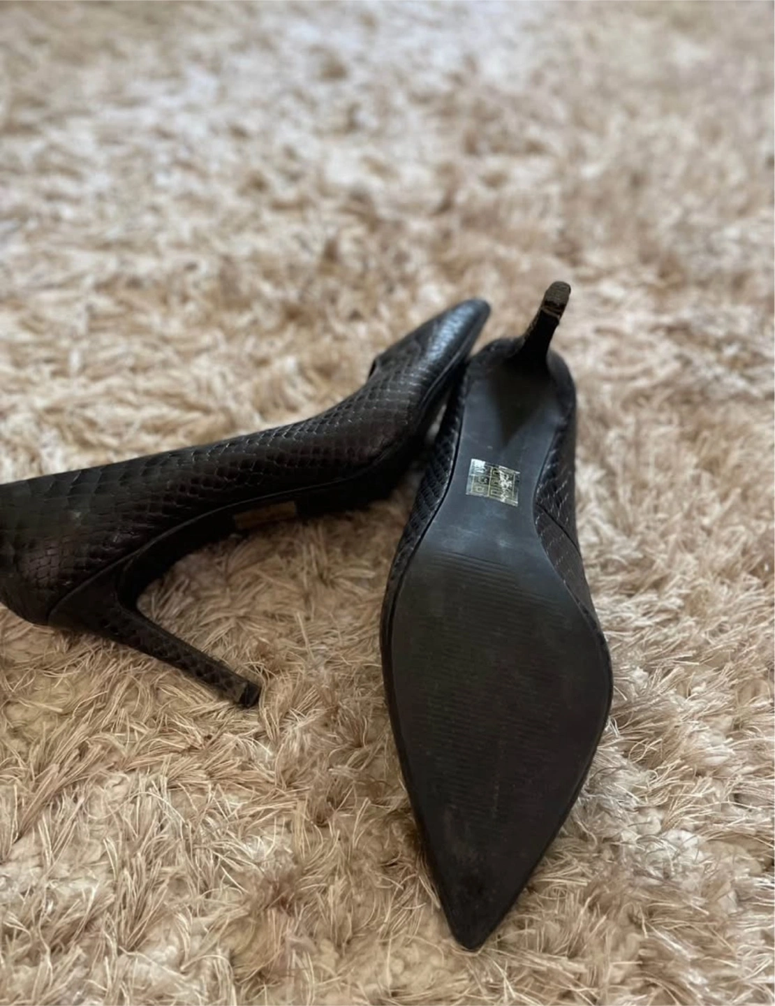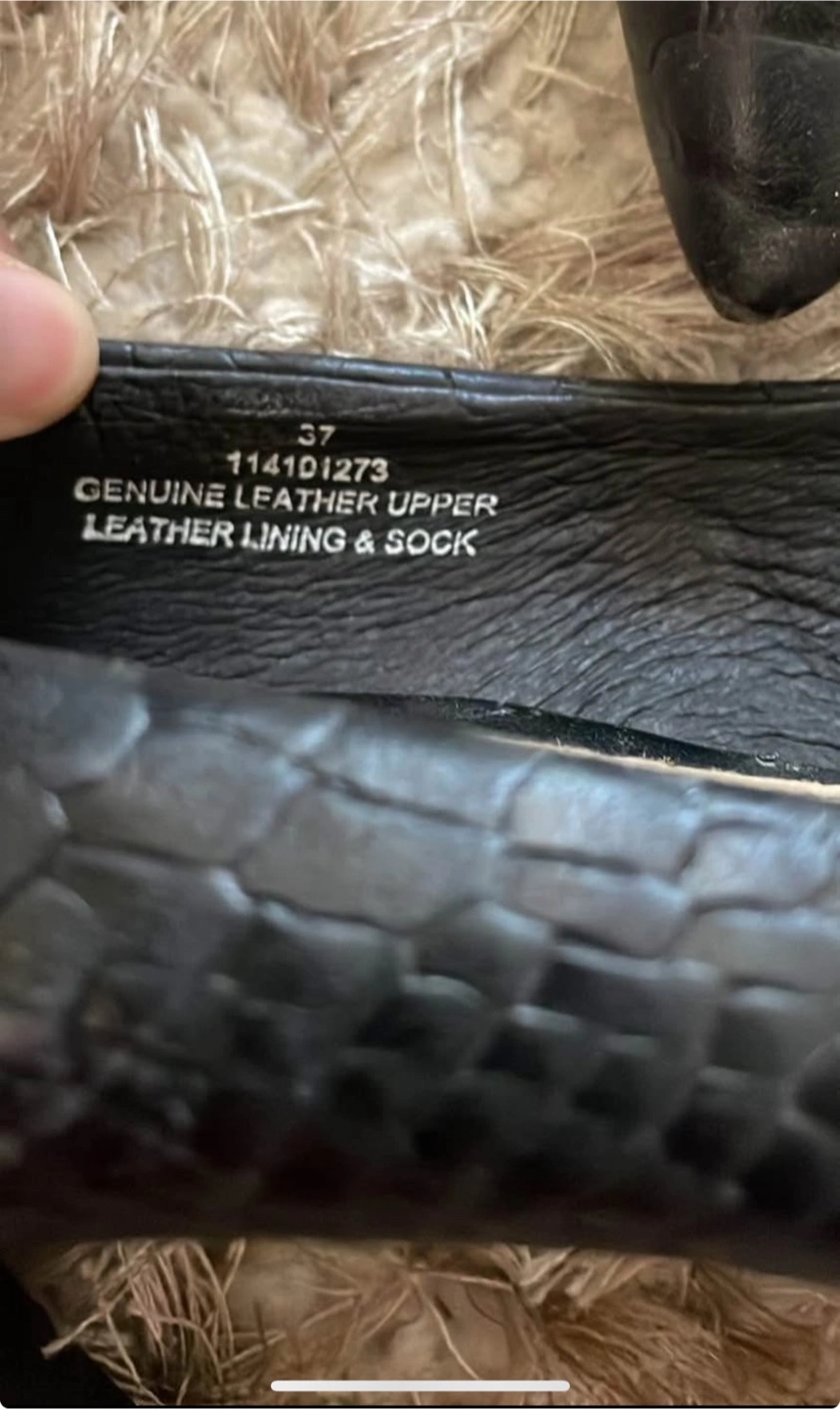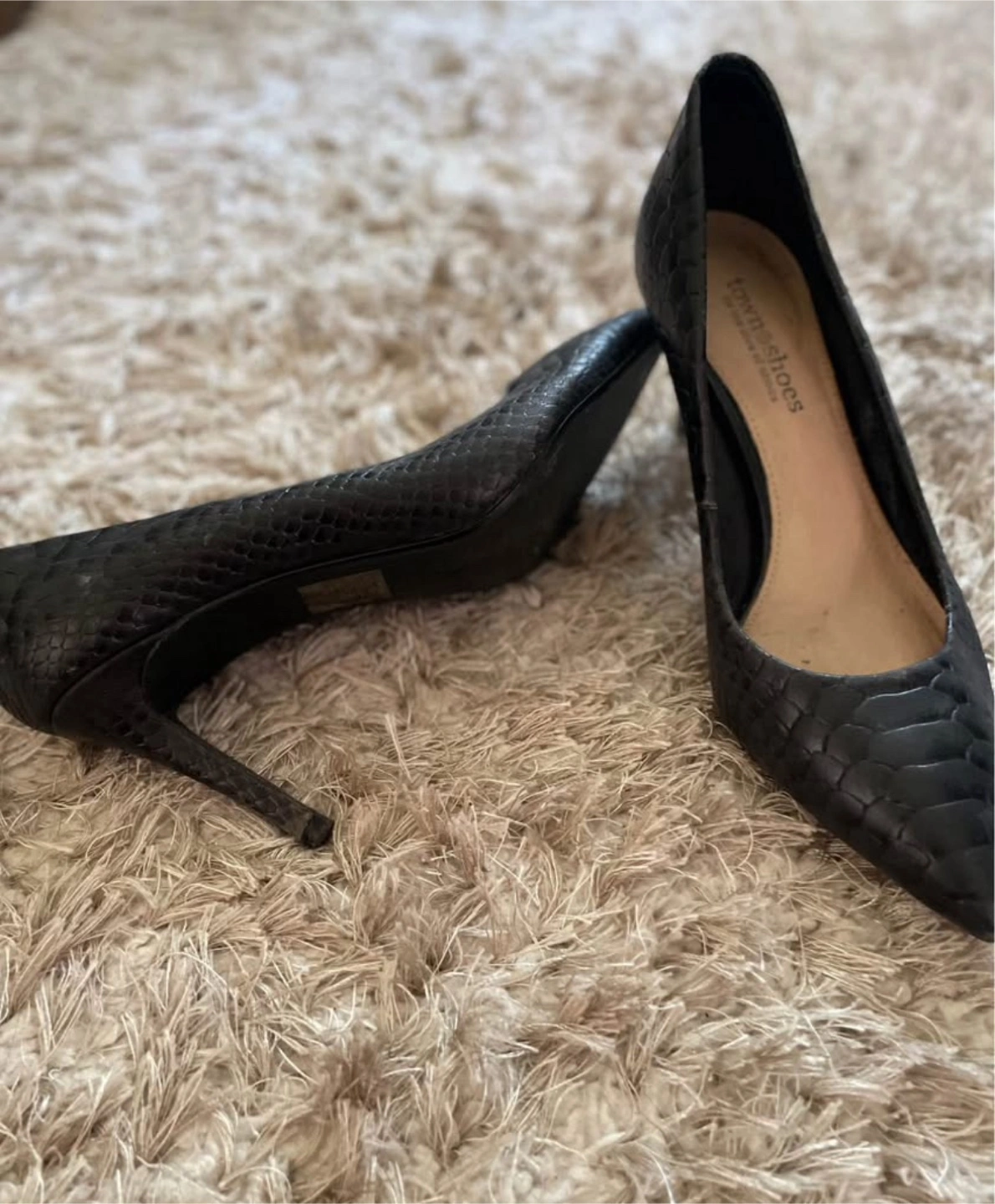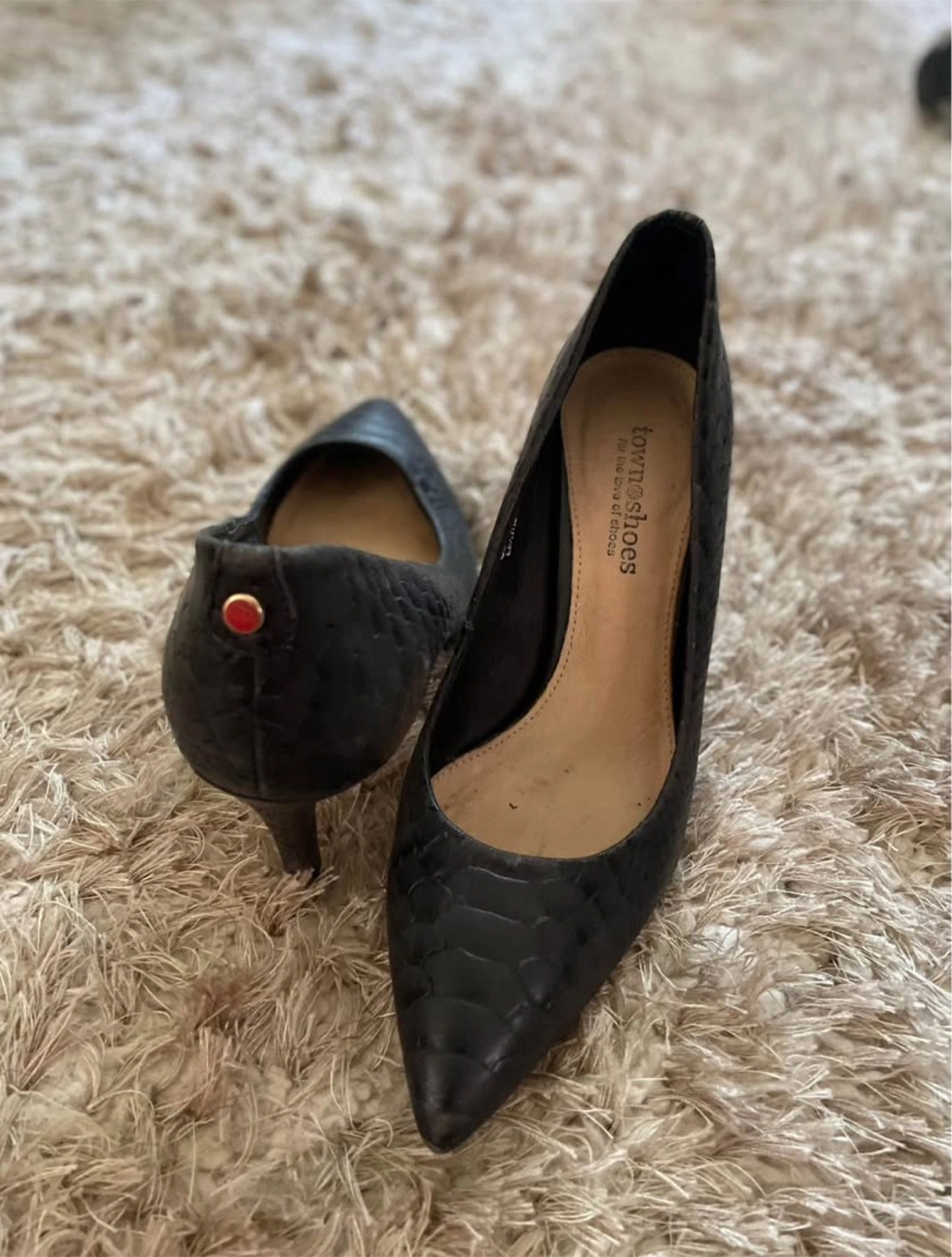 These black heels are from Town Shoes! They're a size 7 (37) and feature a genuine leather upper with leather lining and sock. They have a snakeskin-like pattern. Perfect for dressing up any outfit!