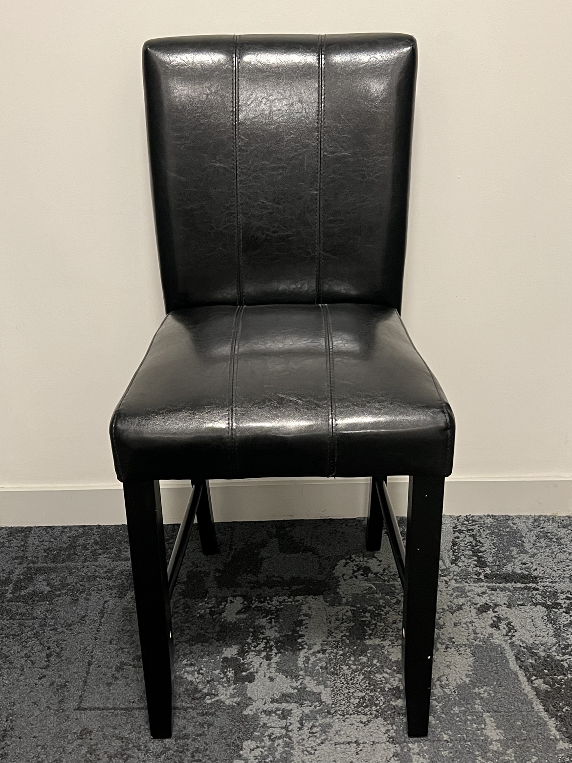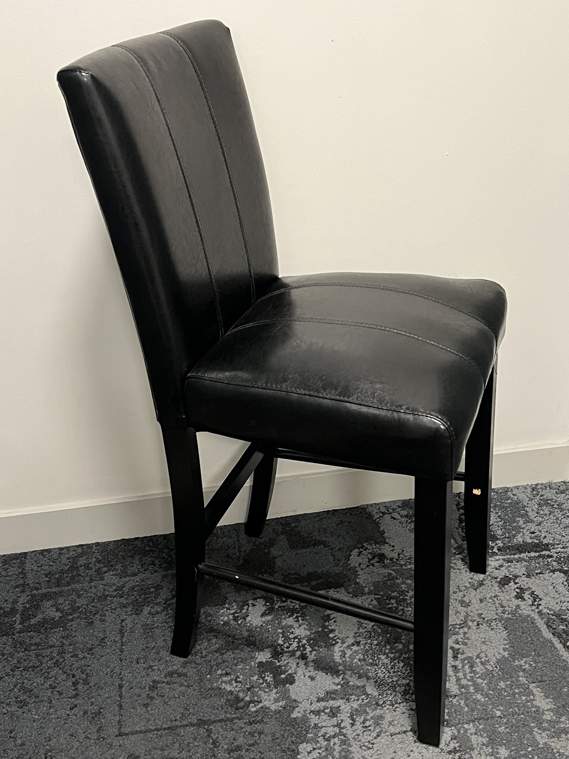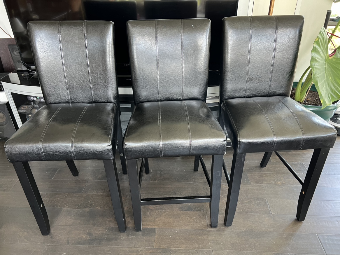 3553 Faux black bar chairs, actually in very good shape - no rips, tears or scratches. Wood frame is solid even tho a couple of support frames are missing but doesn’t effect the strength of the chairs if used properly. Chairs are… Height - 26” and back is 42” Width - 19” Depth - 19” If item is still here, it’s still available. First come first served or whoever pays first. I accept etransfers and live near CN Tower. Free of smoke and pet odours and delivery available in some cases. Check out other items seller has!!