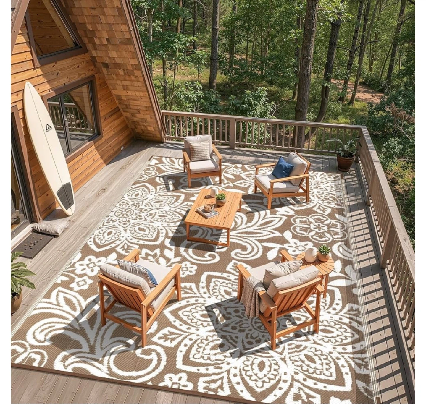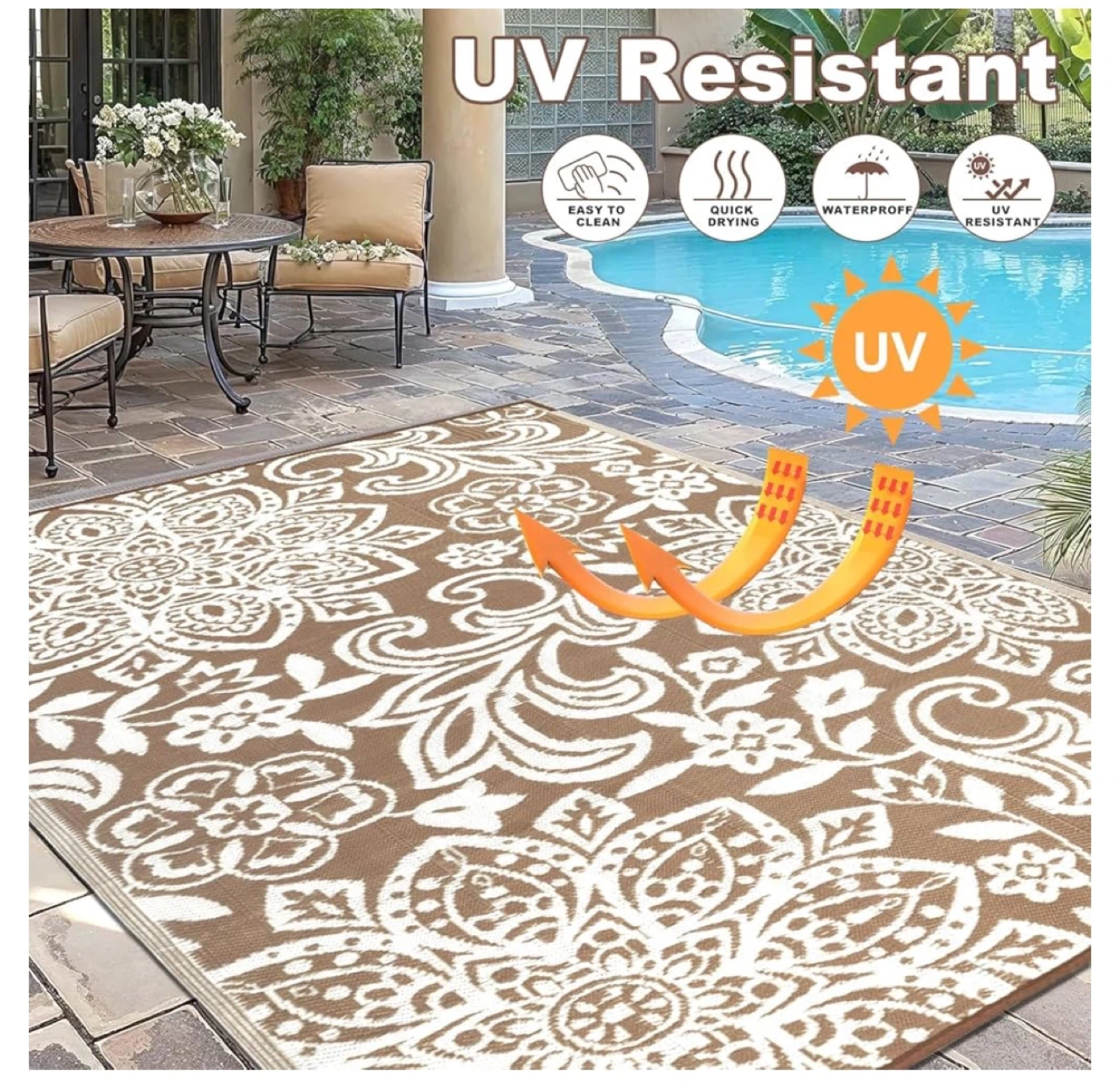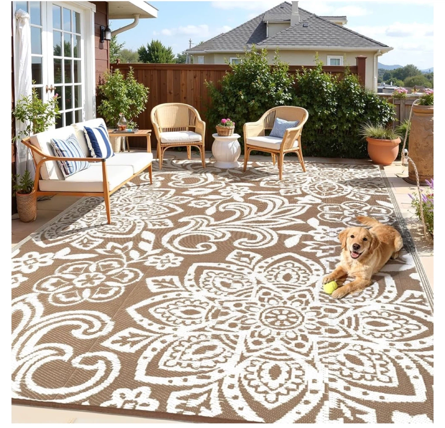 This 8ft x 10ft outdoor area rug features a stylish brown and white floral pattern. It's UV resistant, waterproof, and quick drying for durability. This rug is ideal for patios, decks, or yards.